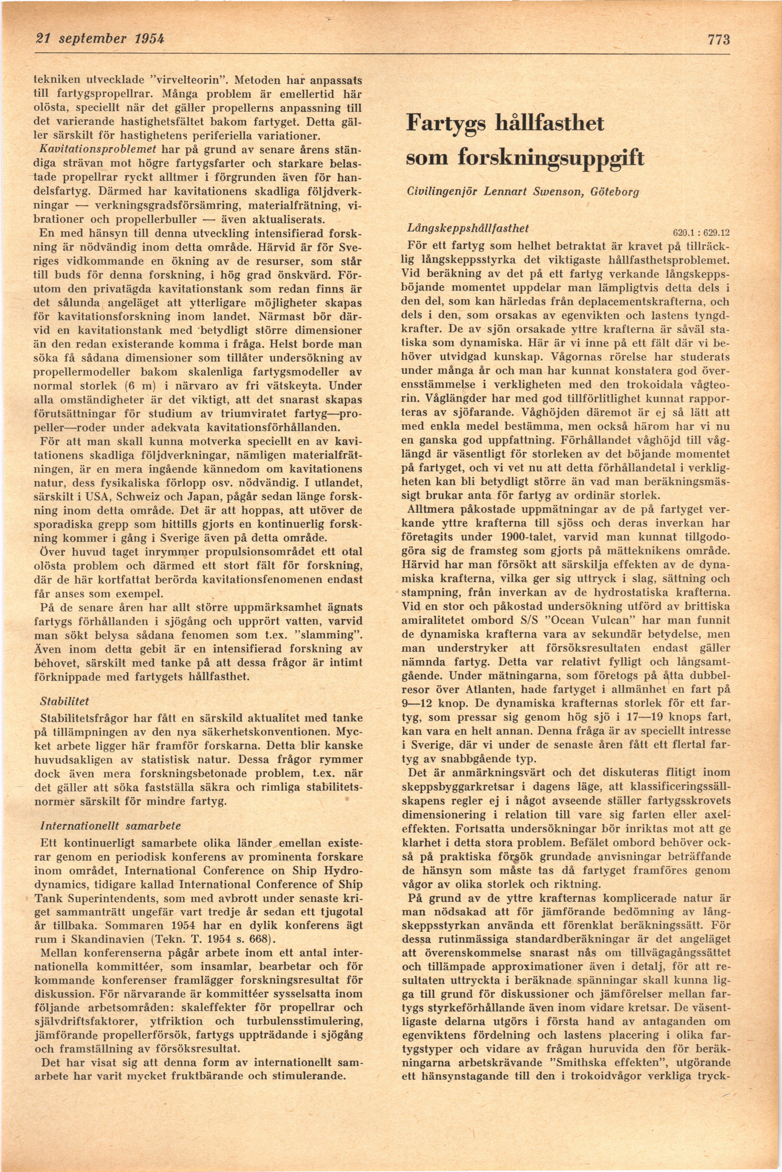Full resolution (JPEG) - On this page / på denna sida - H. 34. 21 september 1954 - Aktuella forskningsuppgifter inom skeppshydrodynamiken, av Hans Edstrand - Fartygs hållfasthet som forskningsuppgift, av Lennart Swenson