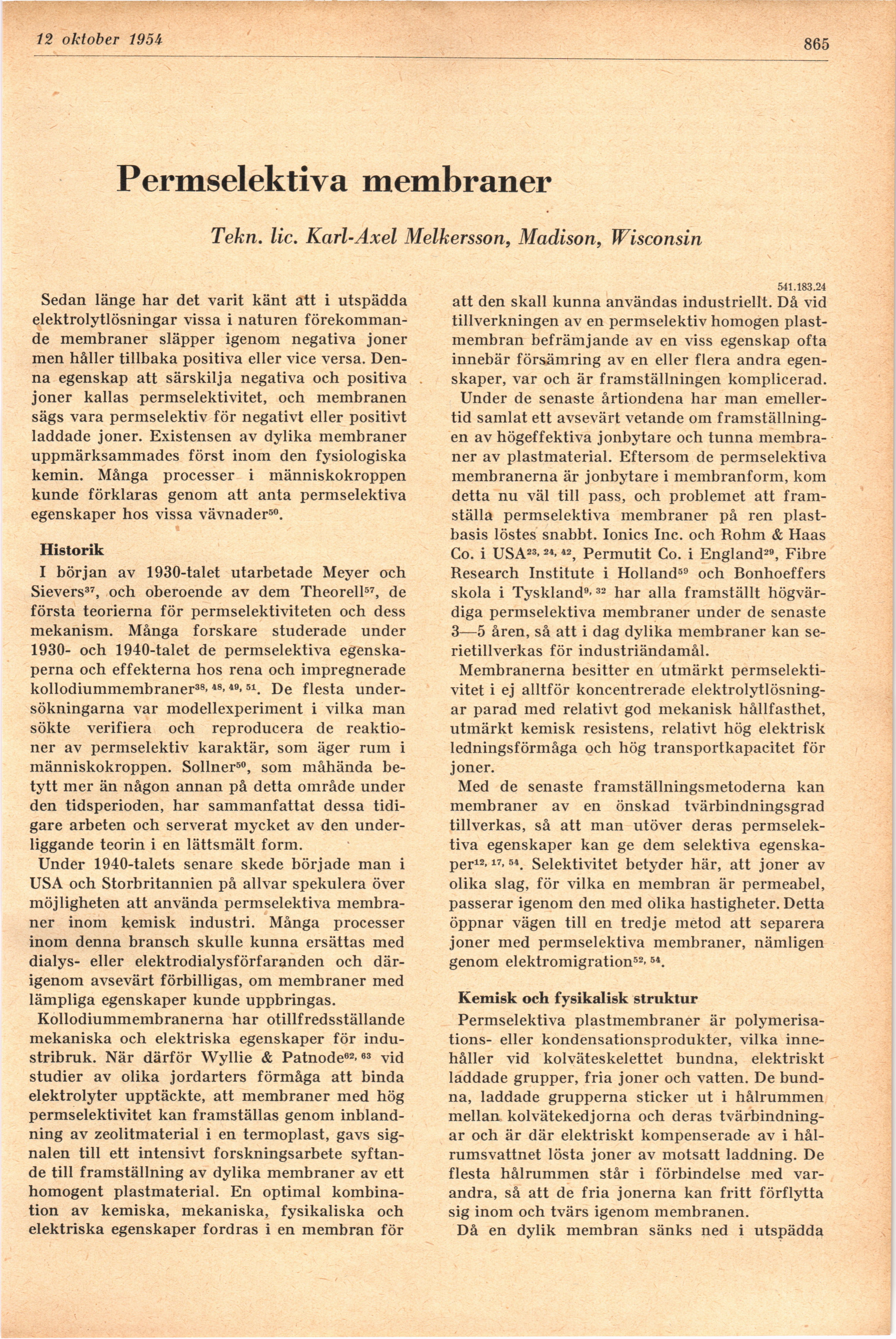 Full resolution (JPEG) - On this page / på denna sida - H. 37. 12 oktober 1954 - Permselektiva membraner, av Karl-Axel Meklersson