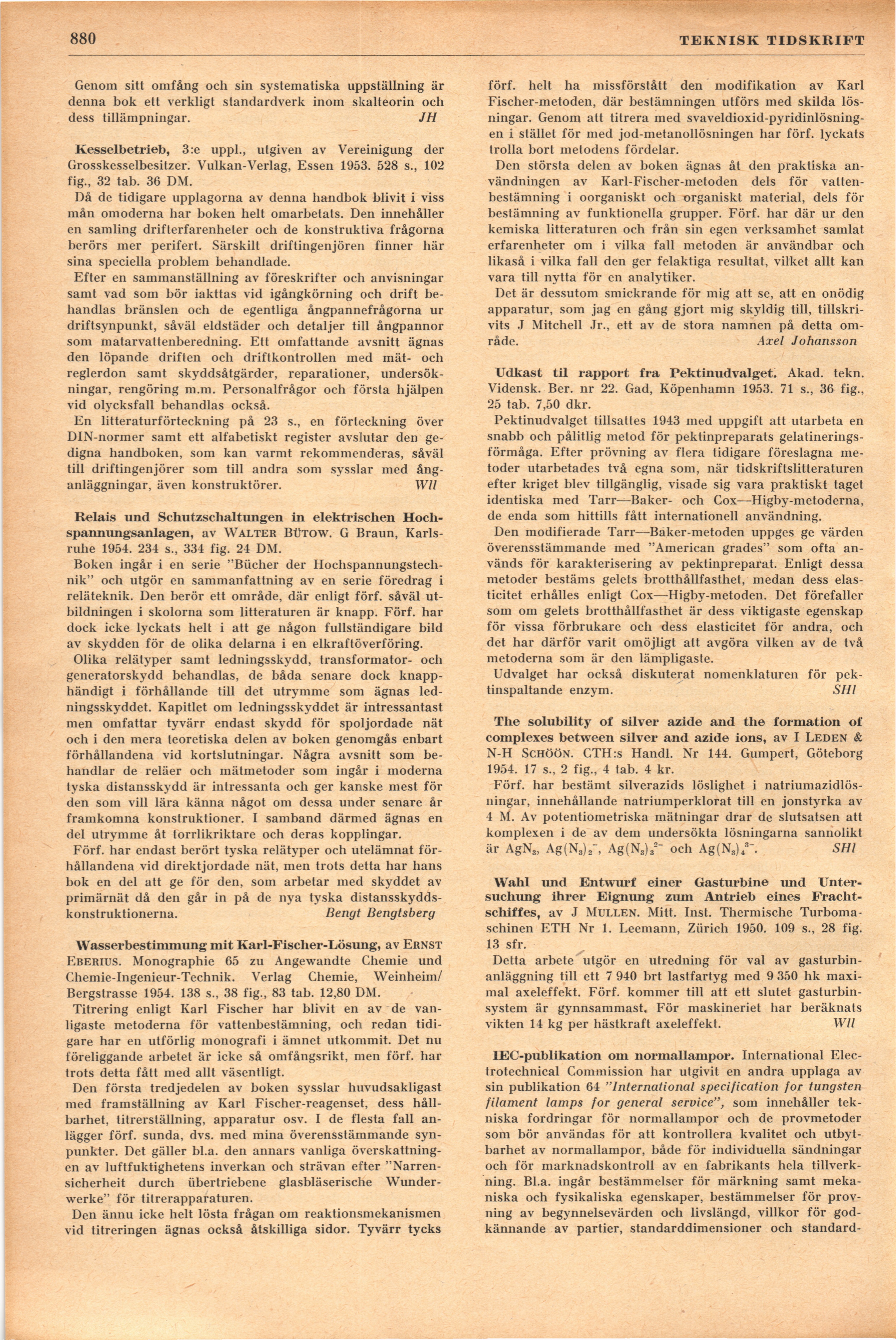 Full resolution (JPEG) - On this page / på denna sida - H. 37. 12 oktober 1954 - Böcker - Flächentragwerke, av JH - Kesselbetrieb, av Wll - Relais und Schutzschaltungen in elektrischen Hochspannungsanlagen, av Bengt Bengtsberg - Wasserbestimmung mit Karl-Fischewr-Lösung, av Axel Johansson - Udkast til rapport fra Pektinudvalget, av SHl - The solubility of silver azide and the formation of complexes between silver and azide ions, av SHl - Wahl und Entwurf einer Gasturbine und Untersuchung ihrer Eignung zum Antrieb eines Frachtschiffes, av Wll - IEC-publikation om normallampor