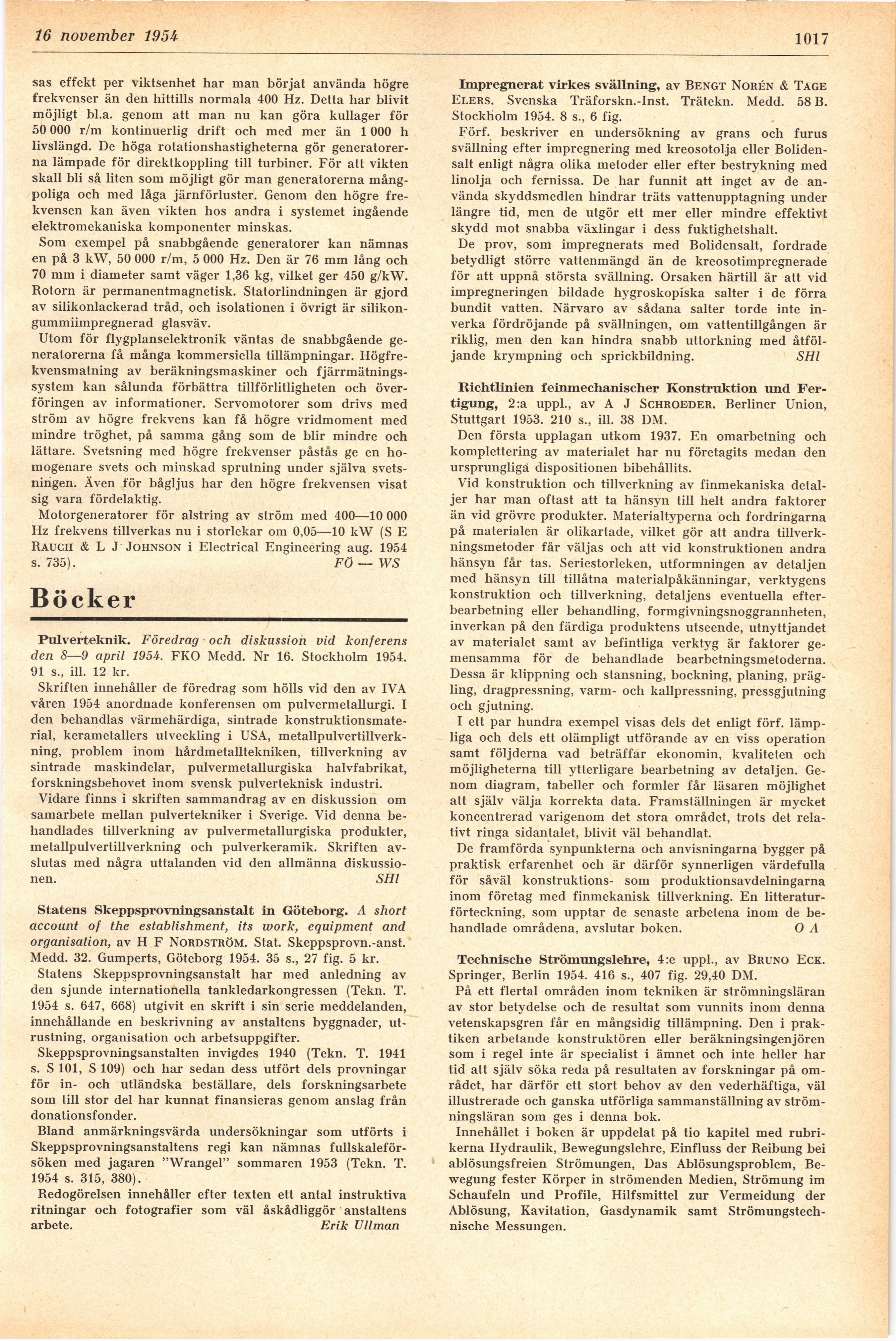 Full resolution (JPEG) - On this page / på denna sida - H. 42. 16 november 1954 - Nya metoder - Lätta snabbgående generatorer, av FÖ — WS - Böcker - Pulverteknik, av SHl - Statens Skeppsprovningsanstalt in Göteborg, av Erik Ullman - Impregnerat virkes svällning, av SHl - Richtlinien feinmechanischer Konstruktion und Fertigung, av O A - Technische Strömungslehre, av Wll