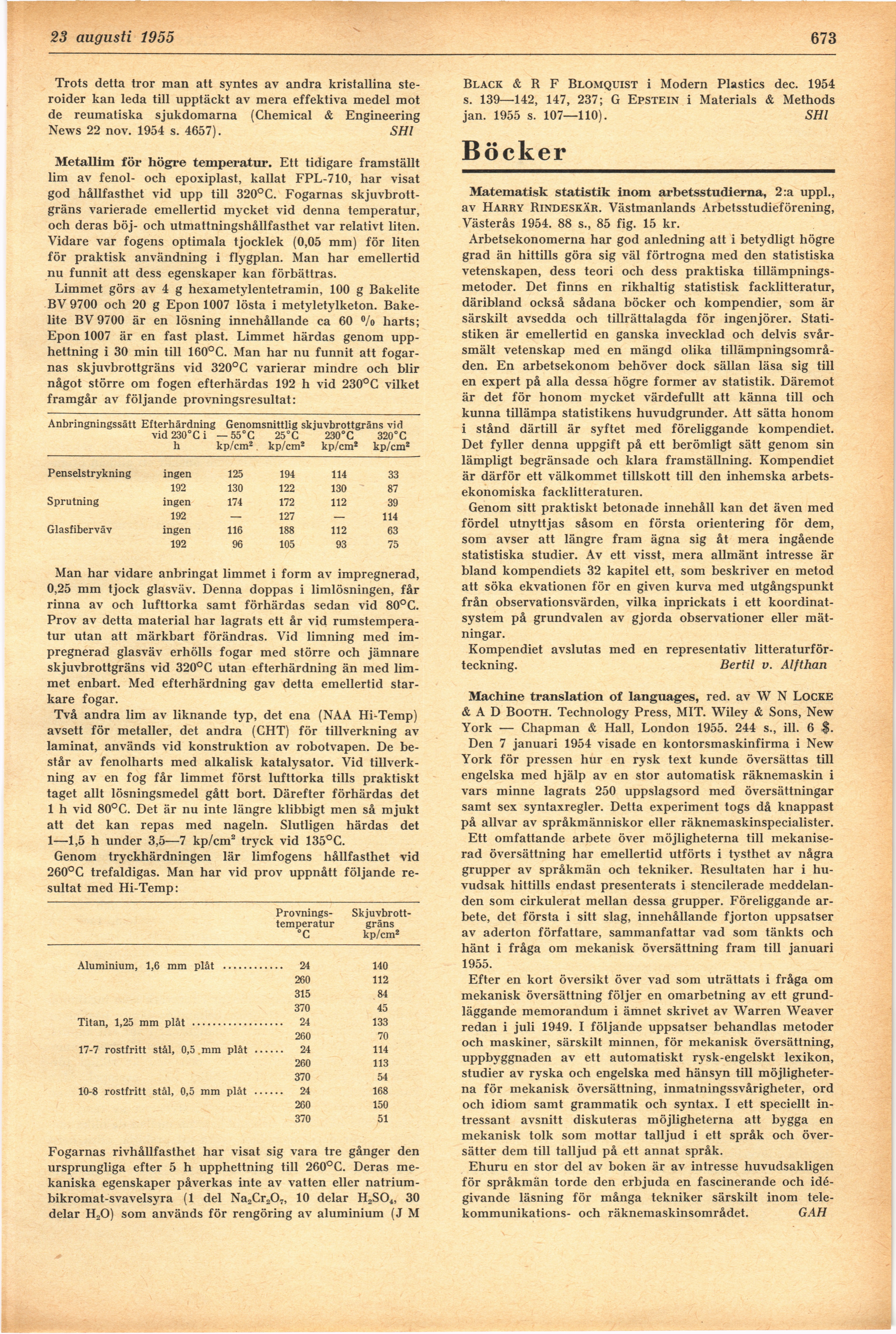 Full resolution (JPEG) - On this page / på denna sida - H. 30. 23 augusti 1955 - Andras erfarenheter - Steroider mot reumatiska sjukdomar, av SHl - Metallim för högre temperatur, av SHl - Böcker - Matematisk statistik inom arbetsstudierna, av Bertil v. Alfthan - Machine translation of languages, av GAH