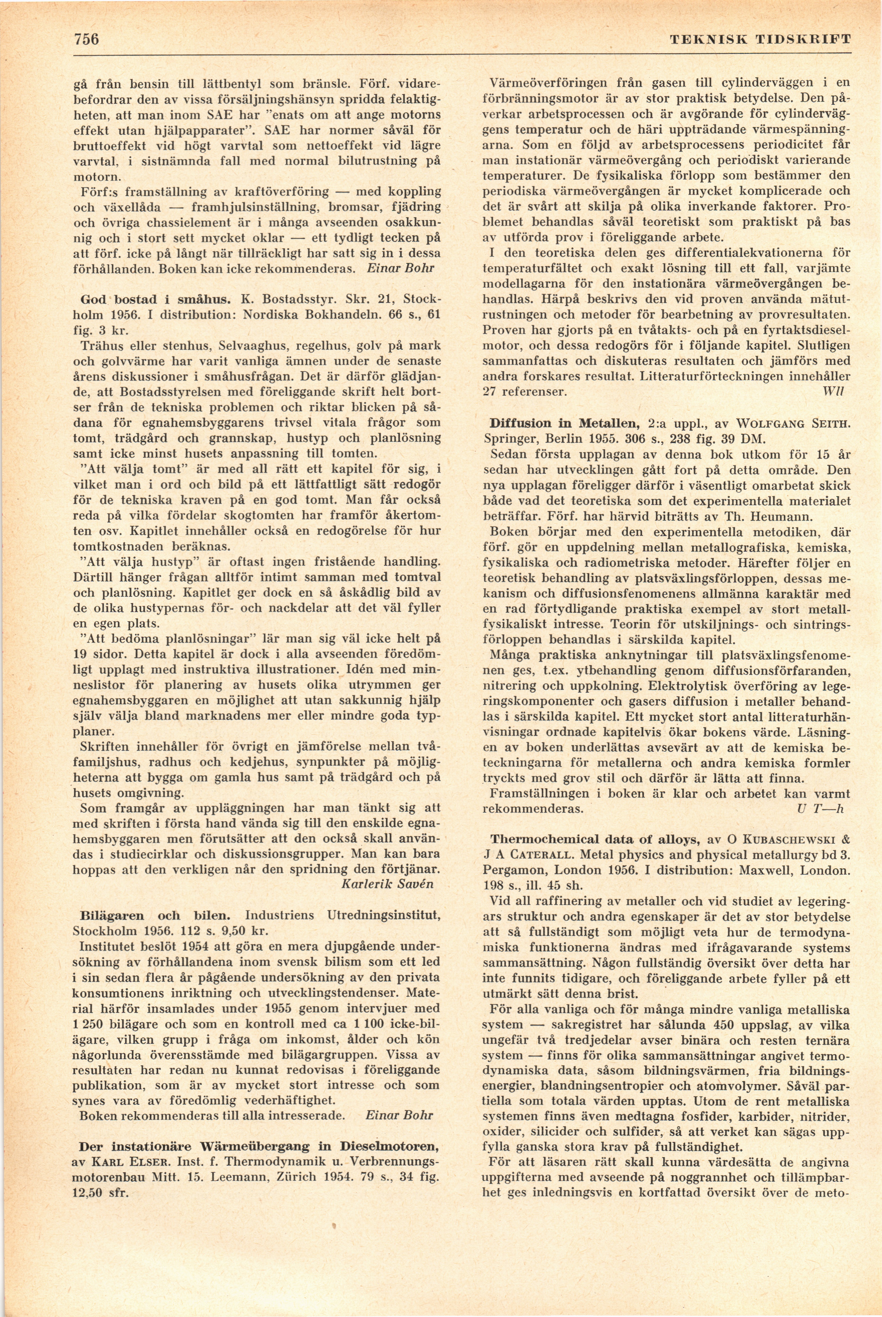 Full resolution (JPEG) - On this page / på denna sida - H. 33. 11 september 1956 - Böcker - Min bil, av Einar Bohr - God bostad i småhus, av Karlerik Savén - Bilägaren och bilen, av Einar Bohr - Der instationäre Wärmeübergang in Dieselmotoren, av Wll - Diffusion in Metallen, av U T—h - Thermochemical data of alloys, av G Björling