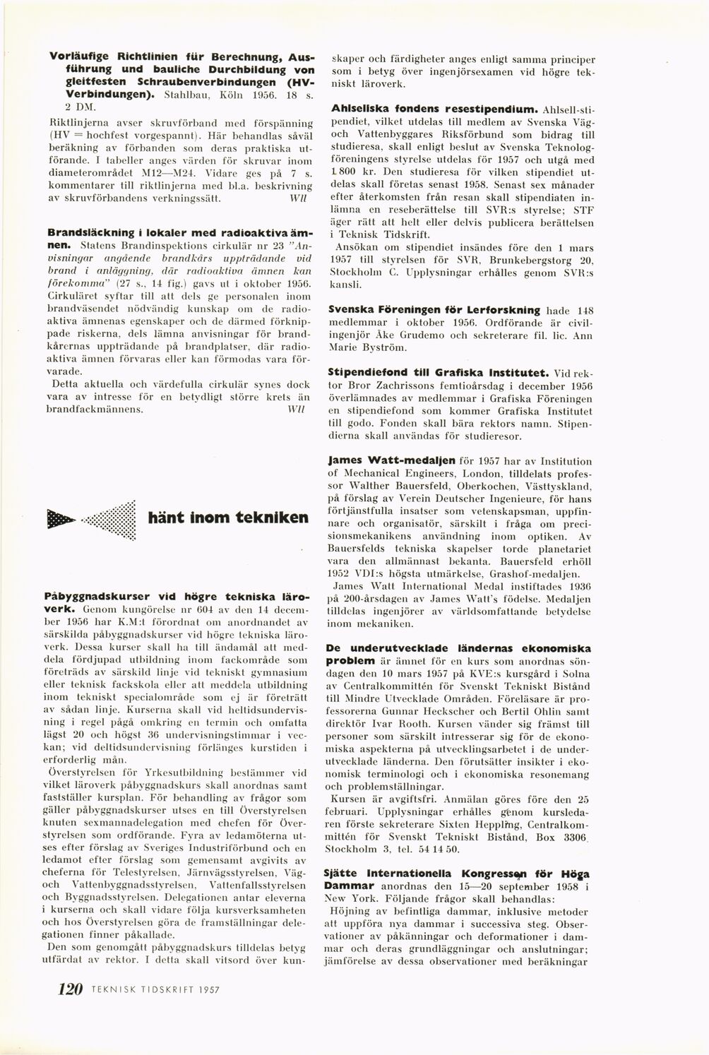 Full resolution (JPEG) - On this page / på denna sida - 1957, H. 6 - Böcker - Vorläufige Richtlinien für Berechnung, Ausführung und bauliche Durchbildung von gleitfesten Schraubenverbindungen (HV-Verbindungen), av Wll - Brandsläckning i lokaler med radioaktiva ämnen, av Wll - Hänt inom tekniken - Påbyggnadskurser vid högre tekniska läroverk - Ahlsellska fondens resestipendium - Svenska Föreningen för Lerforskning - Stipendiefond till Grafiska Institutet - James Watt-medaljen - De underutvecklade ländernas ekonomiska problem - Sjätte Internationella Kongressen för Höga Dammar