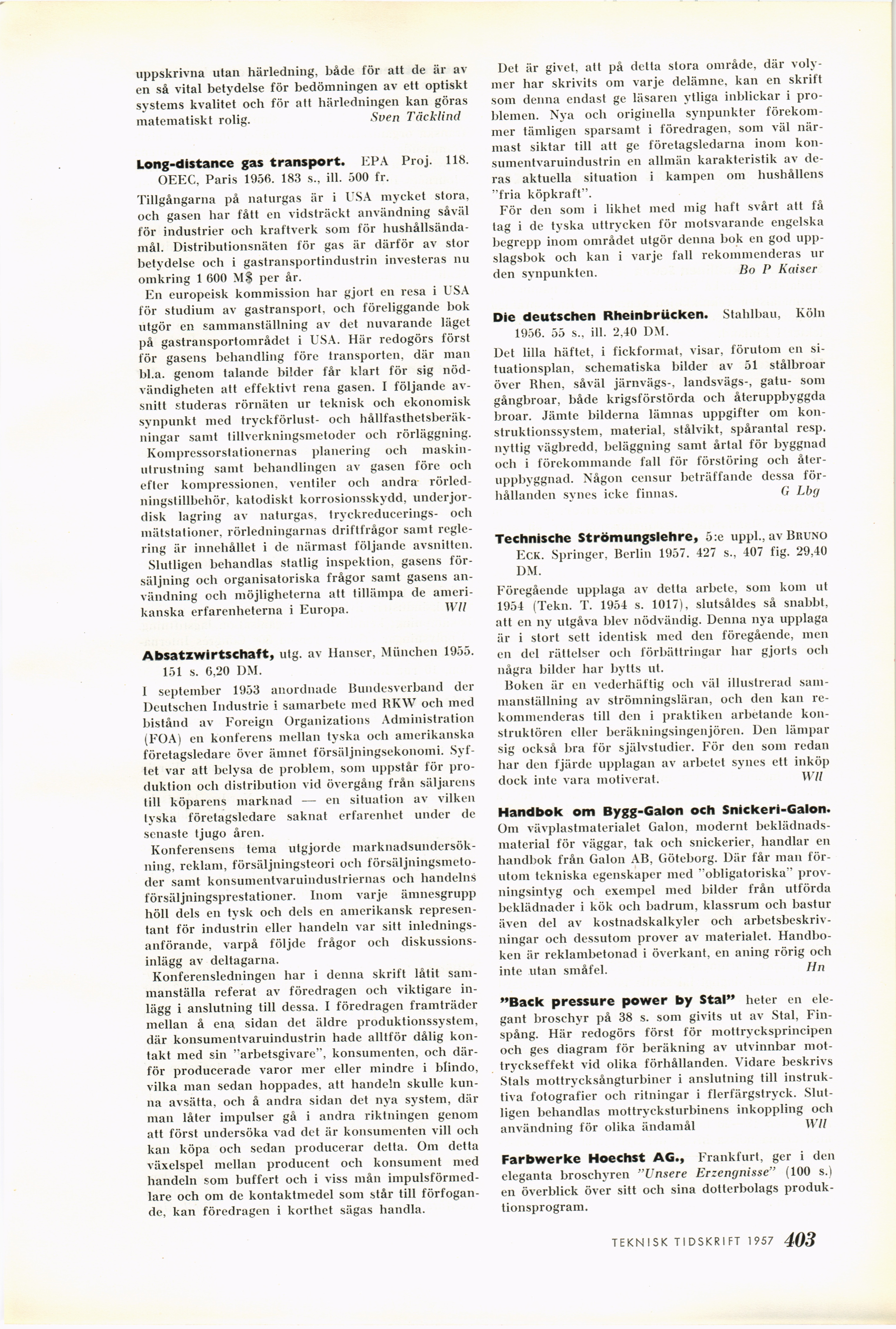Full resolution (JPEG) - On this page / på denna sida - 1957, H. 17 - Böcker - Leitfaden der geometrischen Optik und des Optikrechnens, av Sven Täcklind - Long-distance gas transport, av Wll - Absatzwirtschaft, av Bo P Kaiser - Die deutschen Rheinbrücken, av G Lbg - Technische Strömungslehre, av Wll - Handbok om Bygg-Galon och Snickeri-Galon, av Hn - »Back pressure power by Stal», av Wll - Farbwerke Hoechst AG