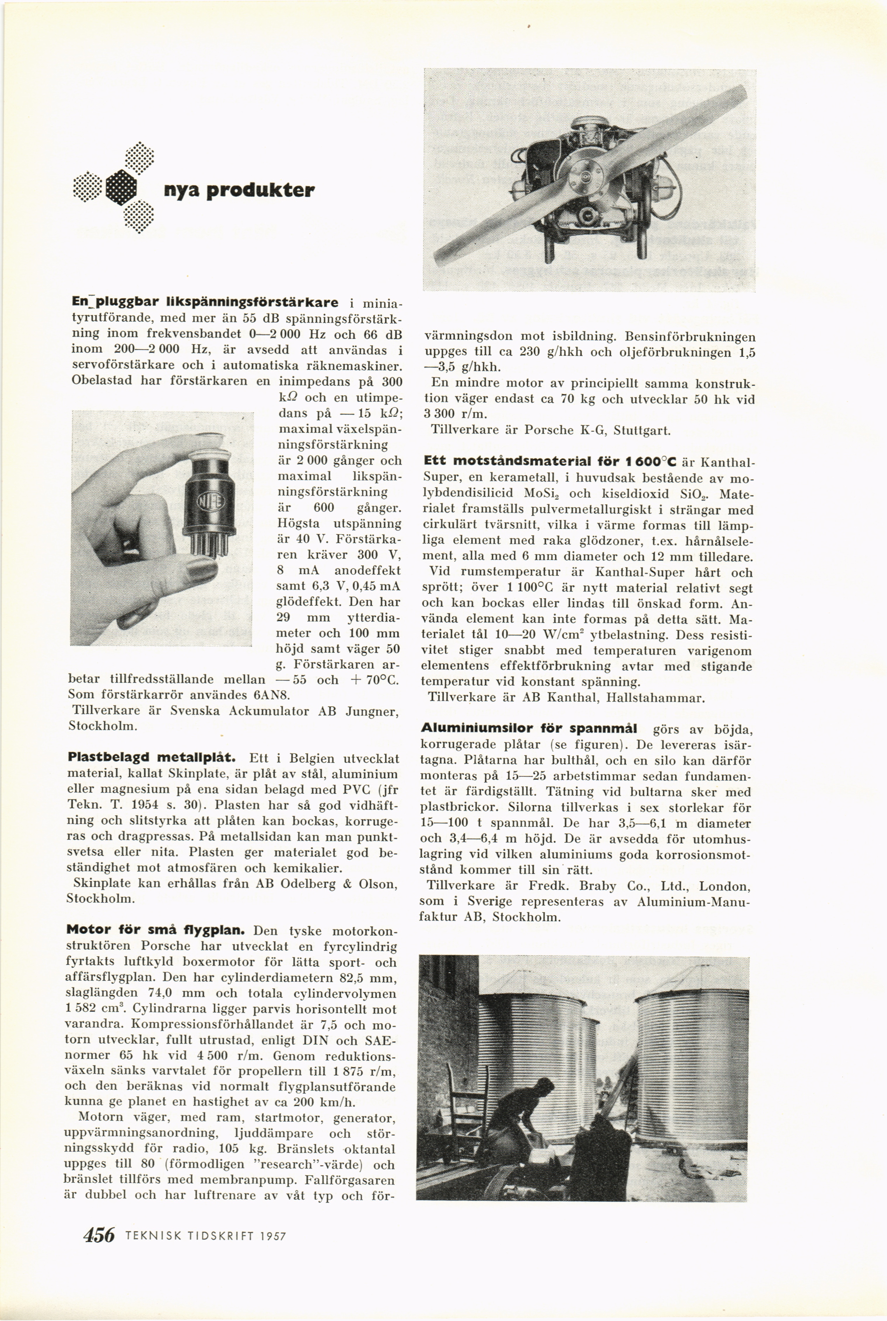 Full resolution (JPEG) - On this page / på denna sida - 1957, H. 19 - Nya produkter - En pluggbar likspänningsförstärkare - Plastbelagd metallplåt - Motor för små flygplan - Ett motståndsmaterial för 1600°C - Aluminiumsilor för spannmål