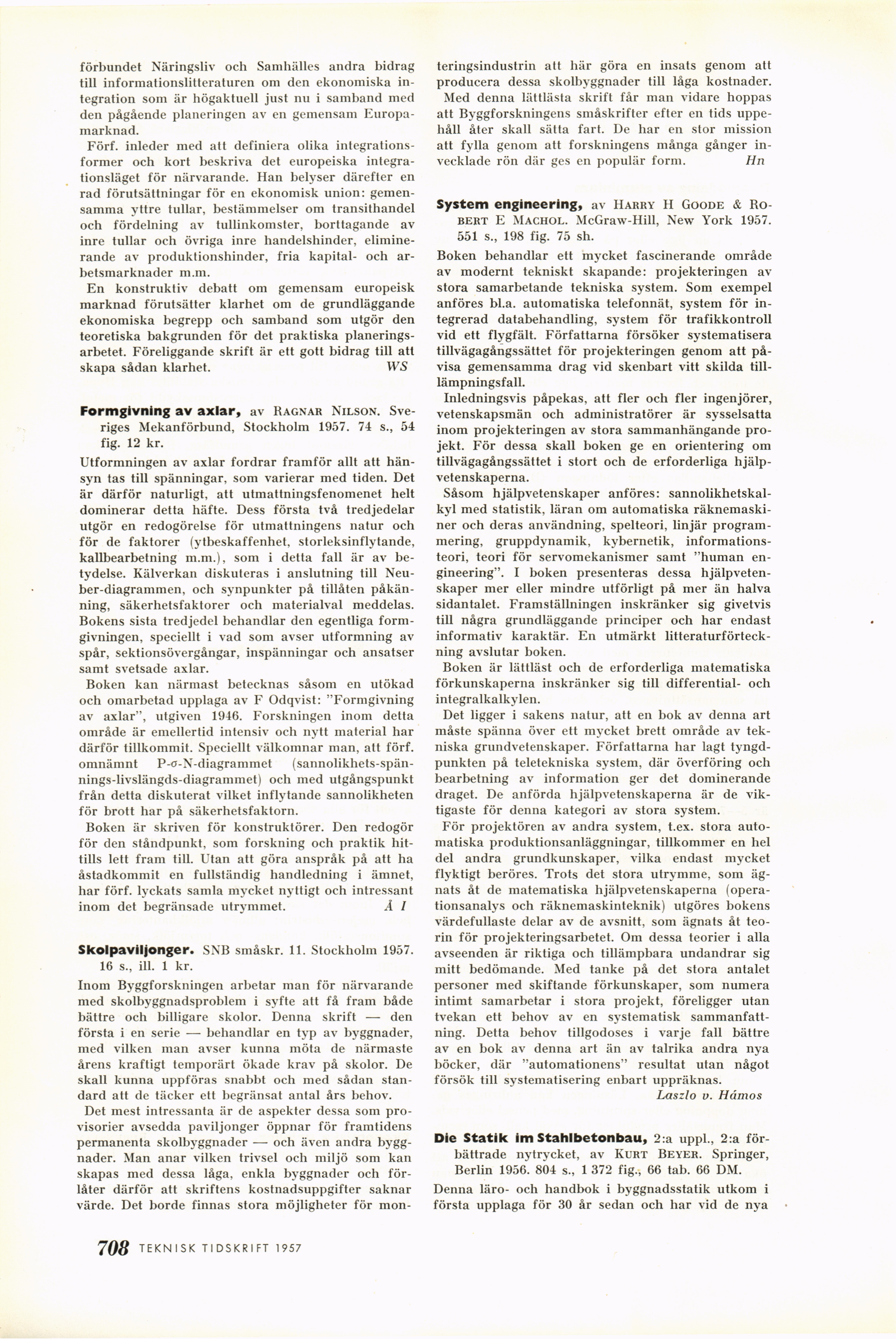 Full resolution (JPEG) - On this page / på denna sida - 1957, H. 31 - Böcker - Ekonomiska unioner, av WS - Formgivning av axlar, av Å I - Skolpaviljonger, av Hn - System engineering, av Laszlo v. Hámos - Die Statik im Stahlbetonbau, av Sven Sahlin