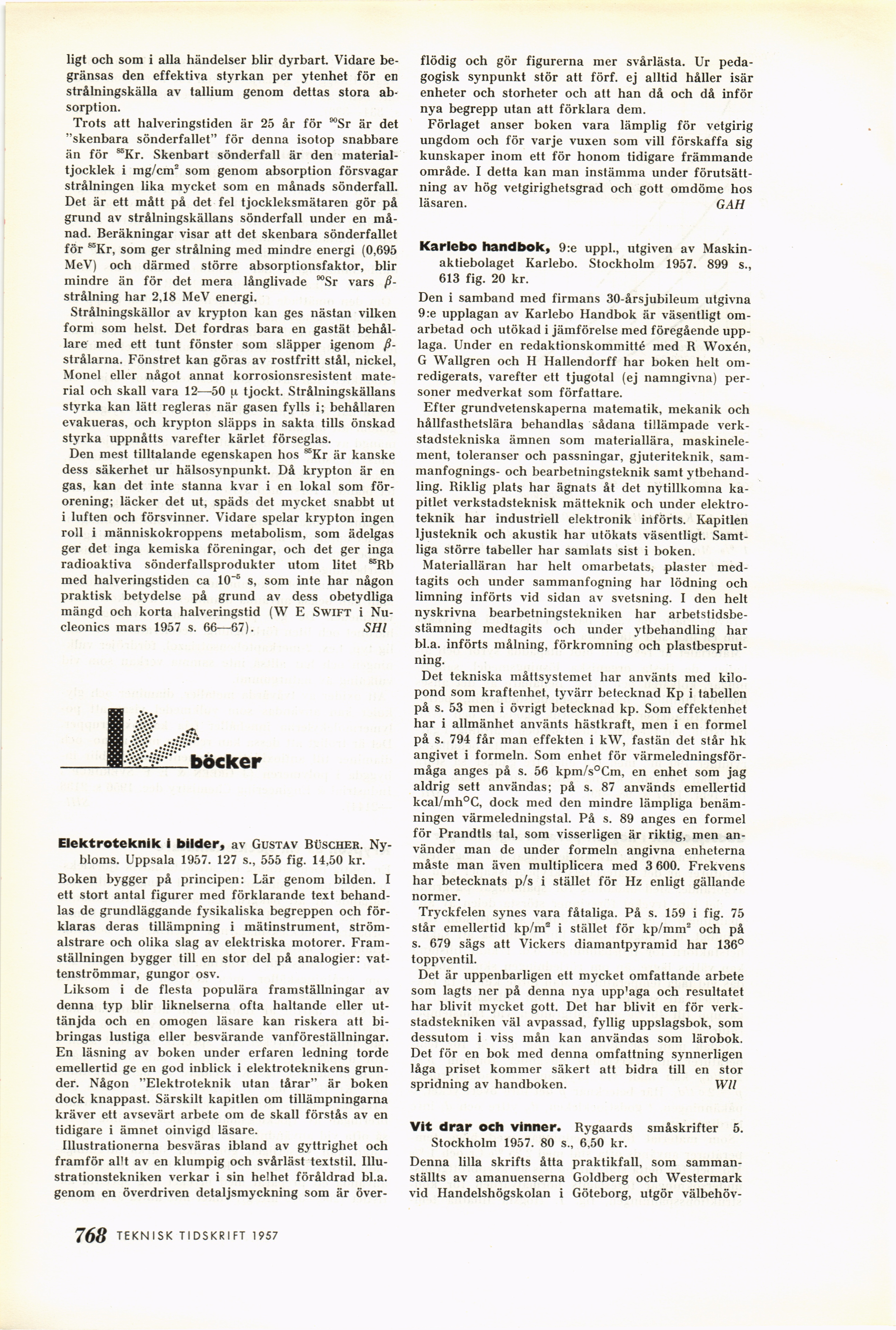 Full resolution (JPEG) - On this page / på denna sida - 1957, H. 33 - Andras erfarenheter - Krypton 85 till tjockleksmätare, av SHl - Böcker - Elektroteknik i bilder, av GAH - Karlebo handbok, av Wll - Vit drar och vinner, av Arne Hedström