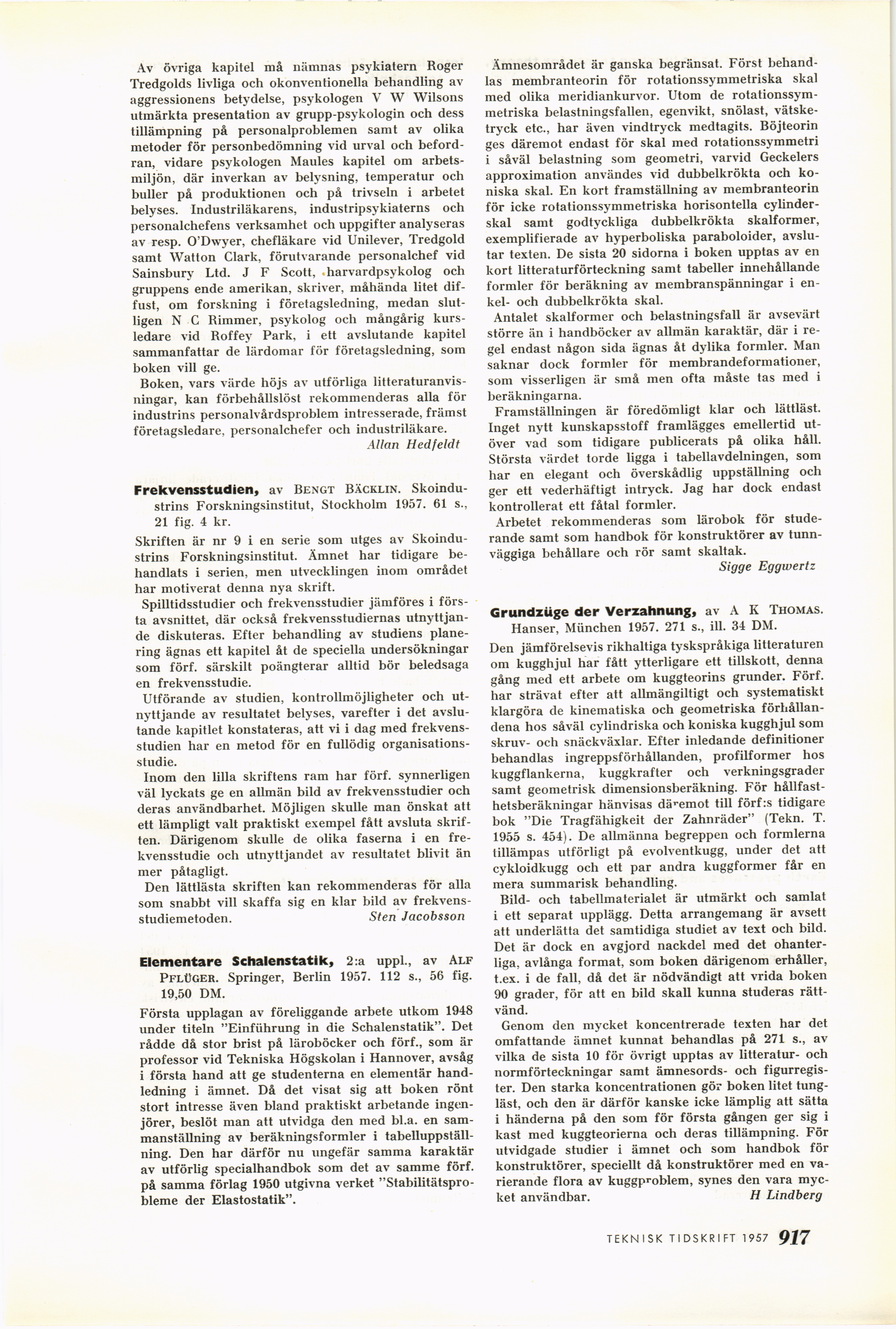 Full resolution (JPEG) - On this page / på denna sida - 1957, H. 38 - Böcker - Psykisk hälsovård och relationerna i arbetet, av Allan Hedfeldt - Frekvensstudien, av Sten Jacobsson - Elementare Schalenstatik, av Sigge Eggwertz - Grundzüge der Verzahnung, av H Lindberg