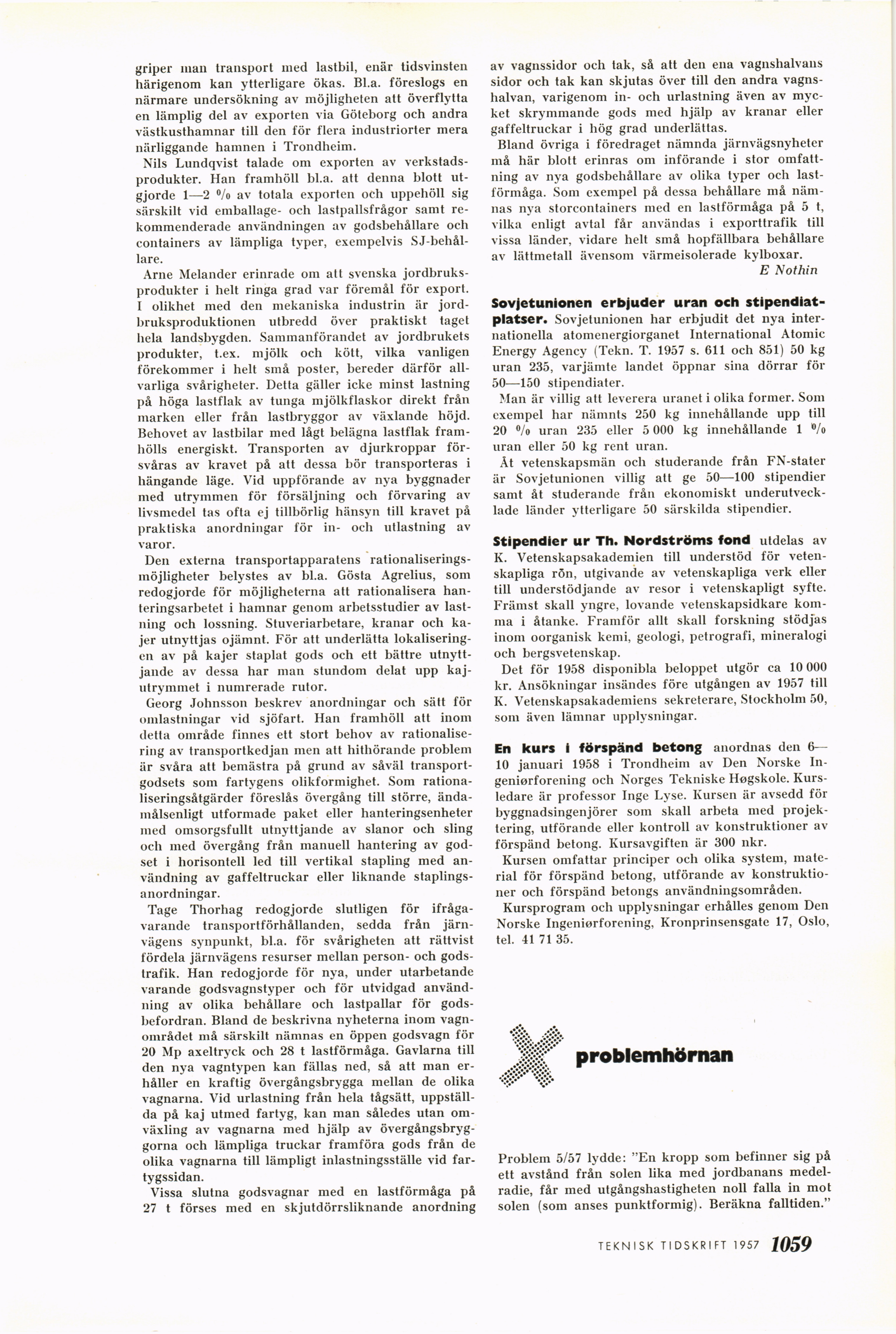 Full resolution (JPEG) - On this page / på denna sida - 1957, H. 43 - Hänt inom tekniken - IVA:s Transportforskningskommissions årsmöte, av E Nothin - Sovjetunionen erbjuder uran och stipendiatplatser - Stipendier ur Th. Nordströms fond - En kurs i förspänd betong - Problemhörnan, av A Lg