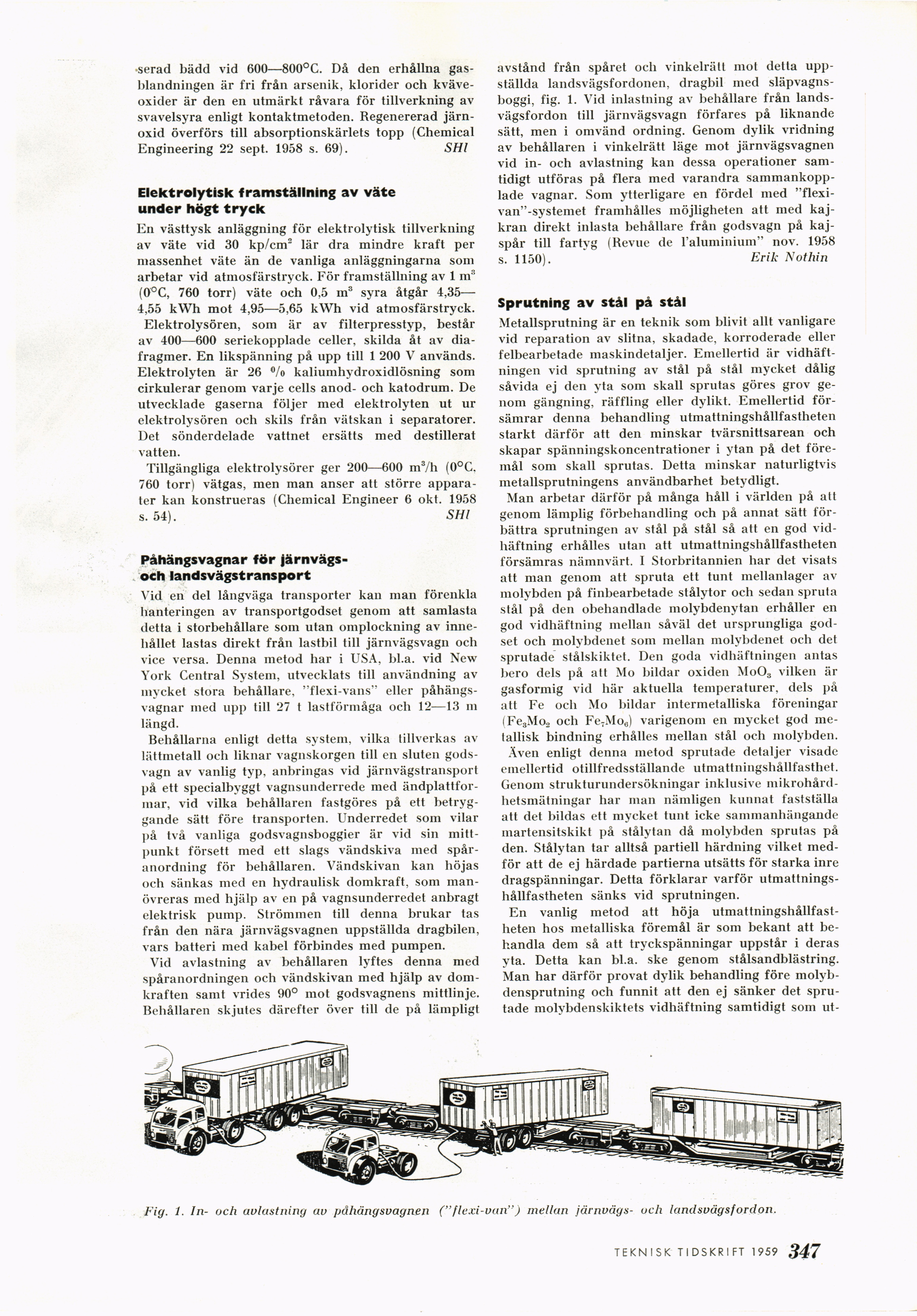 Full resolution (JPEG) - On this page / på denna sida - 1959, H. 14 - Nya metoder - Avsvavling av koksugnsgas i fluidiserad bädd, av SHl - Elektrolytisk framställning av väte under högt tryck, av SHl - Påhängsvagnar för järnvägs- och landsvägstransport, av Erik Nothin - Sprutning av stål på stål, av KJB