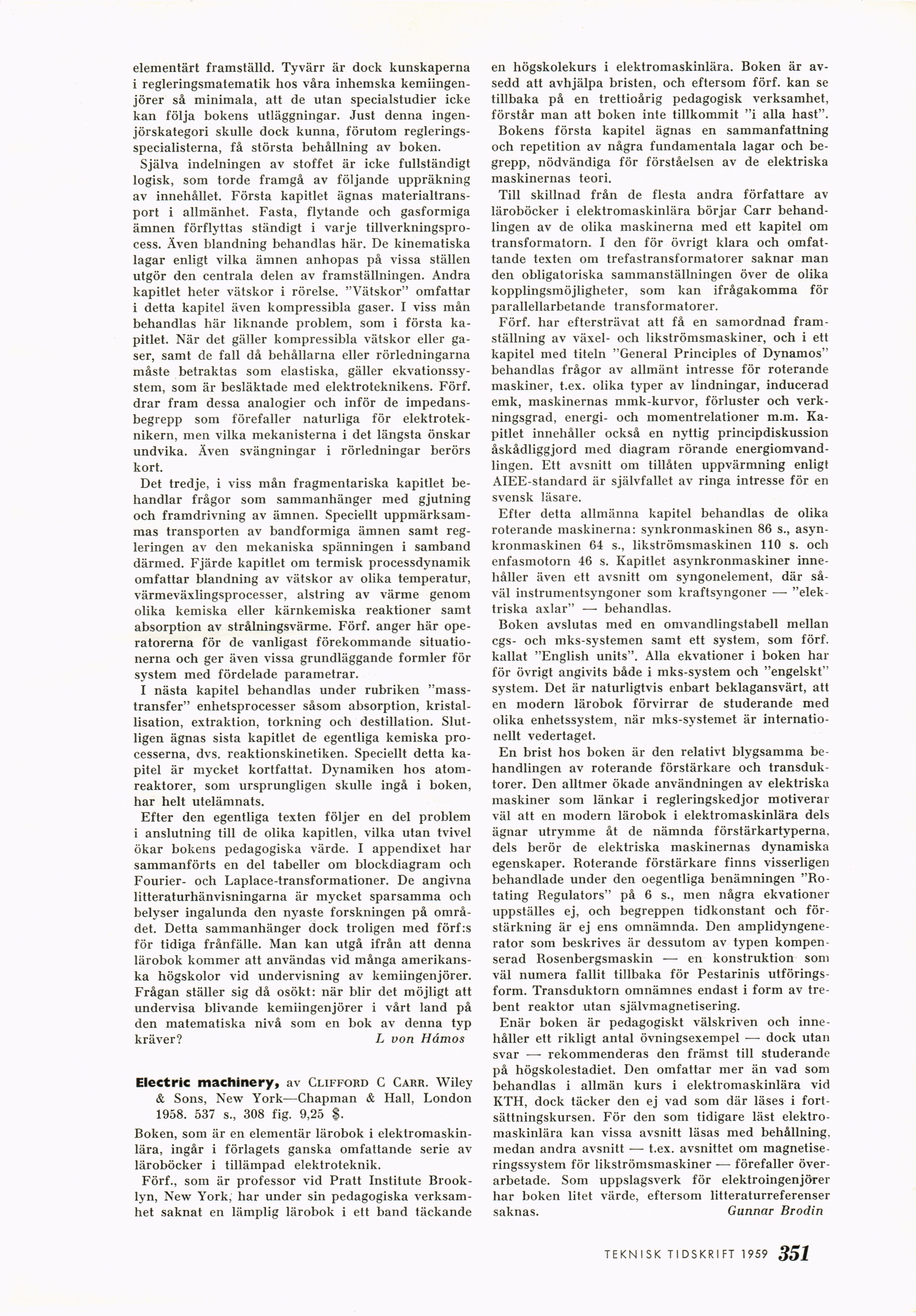 Full resolution (JPEG) - On this page / på denna sida - 1959, H. 14 - Böcker - Process dynamics — dynamic behaviour of the production process, av L von Hámos - Electric machinery, av Gunnar Brodin