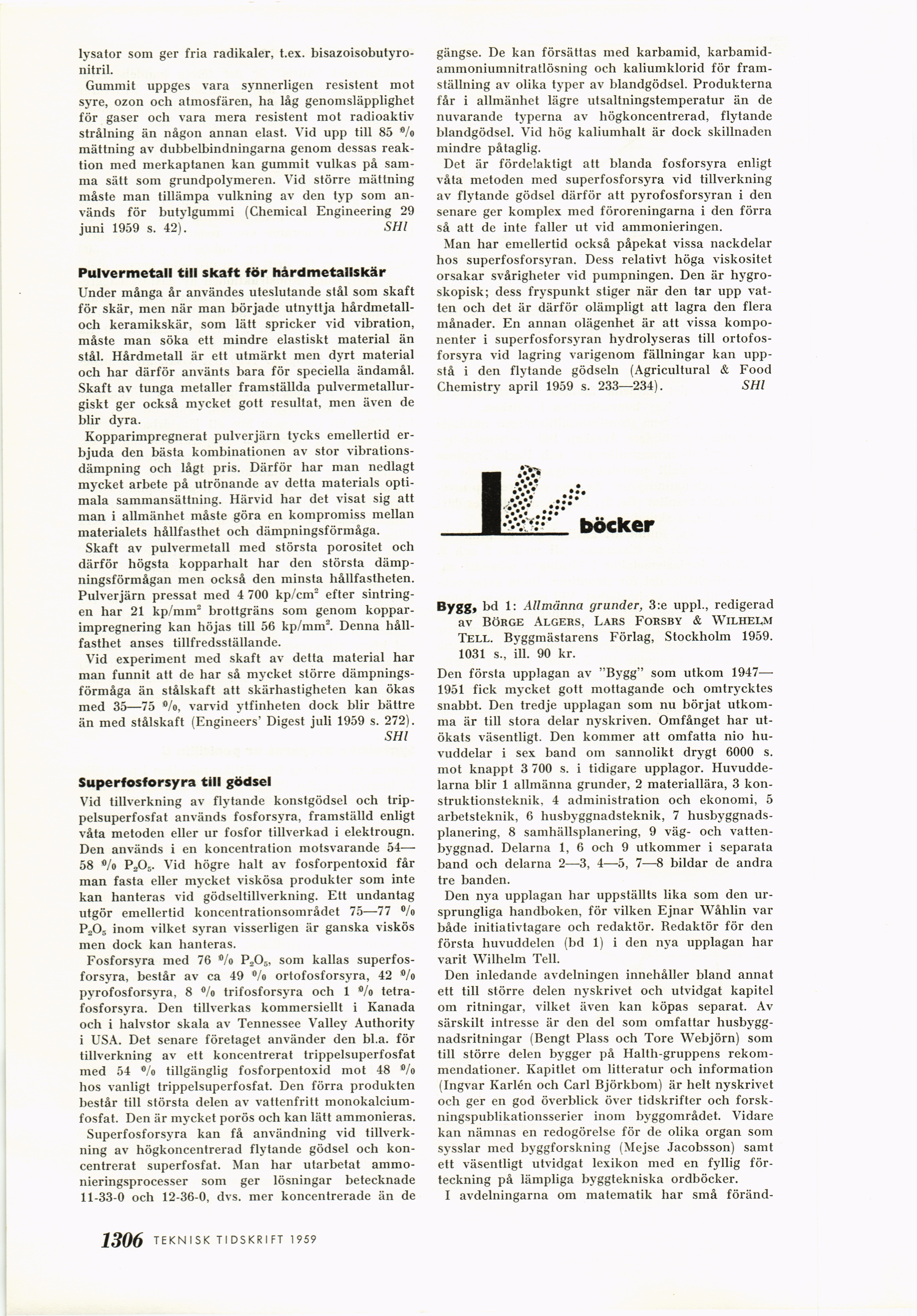 Full resolution (JPEG) - On this page / på denna sida - 1959, H. 46 - Andras erfarenheter - Strålningsresistent gummi, av SHl - Pulvermetall till skaft för hårdmetallskär, av SHl - Superfosforsyra till gödsel, av SHl - Böcker - Bygg, bd 1, av B Sundberg
