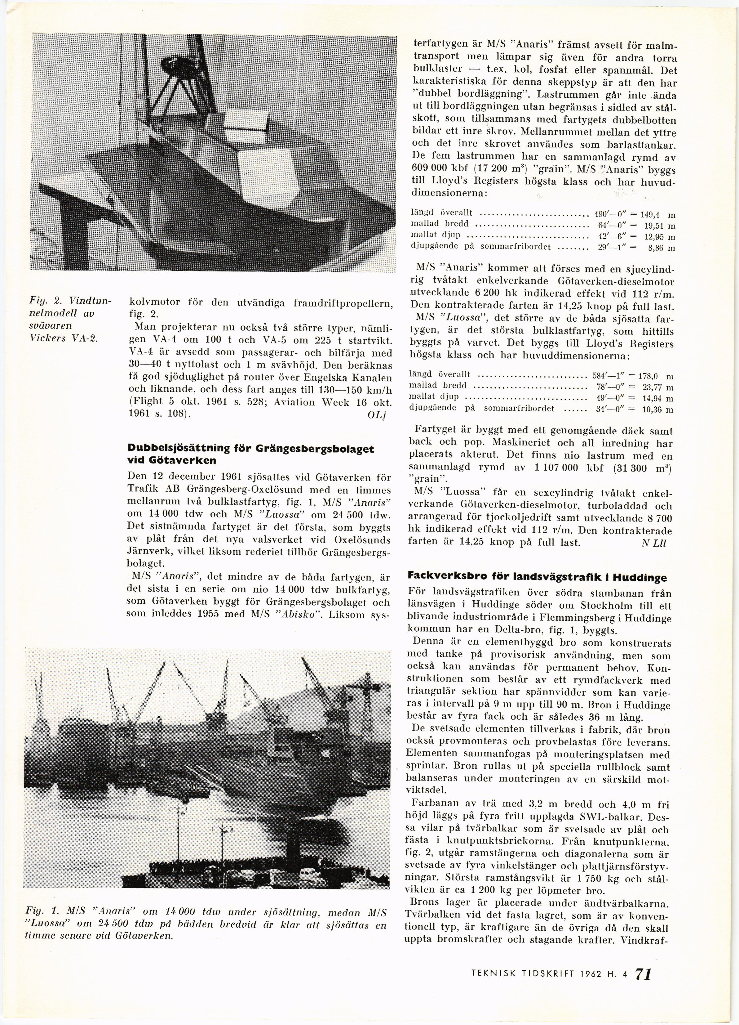 Full resolution (JPEG) - On this page / på denna sida - 1962, H. 4 - Nybyggen - Brittiska markeffektfarkoster, av OLj - Dubbelsjösättning för Grängesbergsbolaget vid Götaverken, av N Lll - Fackverksbro för landsvägstrafik i Huddinge, av BoJ