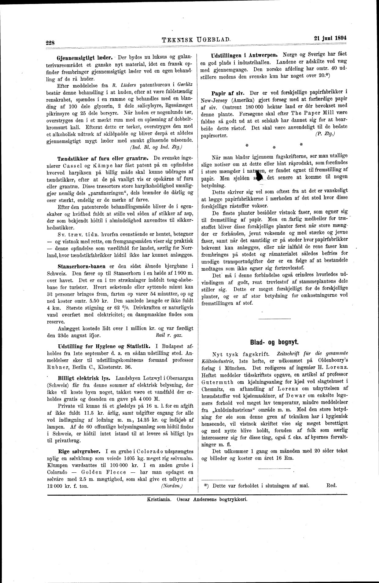 Full resolution (TIFF) - On this page / på denna sida - No. 25. 21 juni 1894 - Tekniske nyheder - Gjennemsigtigt læder - Tændstikker af furu eller grantræ - Stanserhorn-banen - Udstilling for Hygiene og Statistik - Billigt elektrisk lys - Rige sølvgruber - Udstillingen i Antwerpen - Papir af siv - Blad- og bognyt: Zeitschrift für die gesammte Kälteindustrie