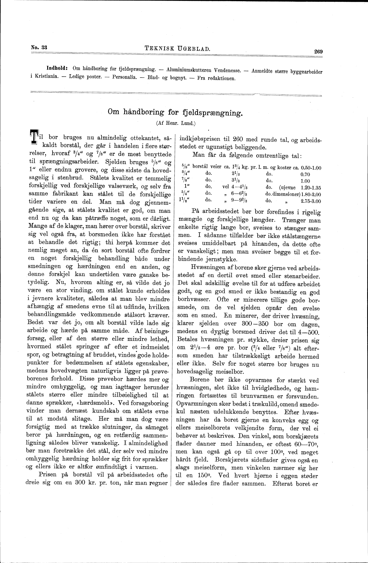 Full resolution (TIFF) - On this page / på denna sida - No. 33. 16 august 1894 - Om håndboring for fjeldsprængning, af Henr. Lund