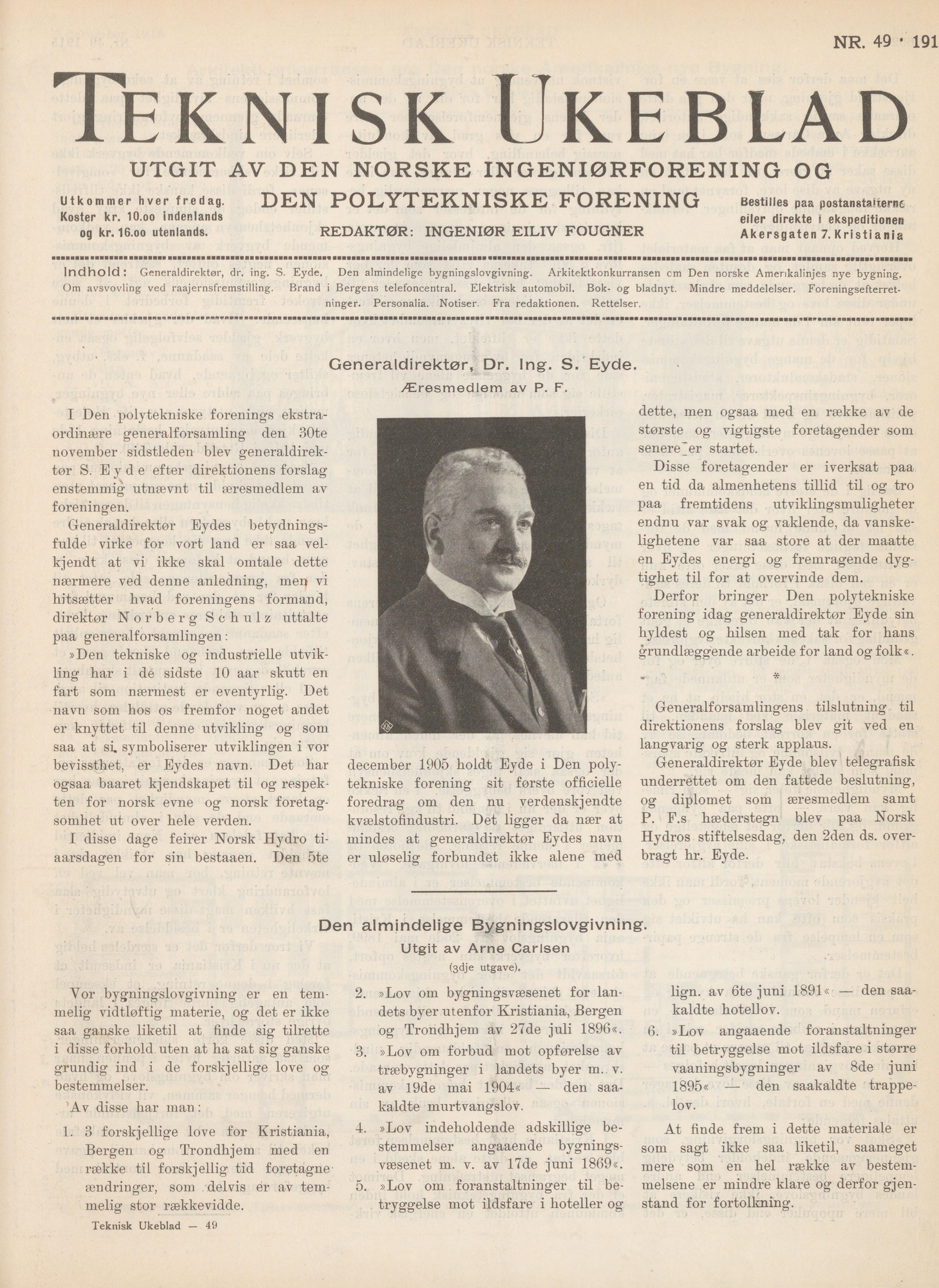 Indhold: Generaldirektør, dr. ing. S. Eyde. Den almindelige bygningslovgivning. Arkitektkonkurransen cm Den norske Amenkalinjes nye bygning.