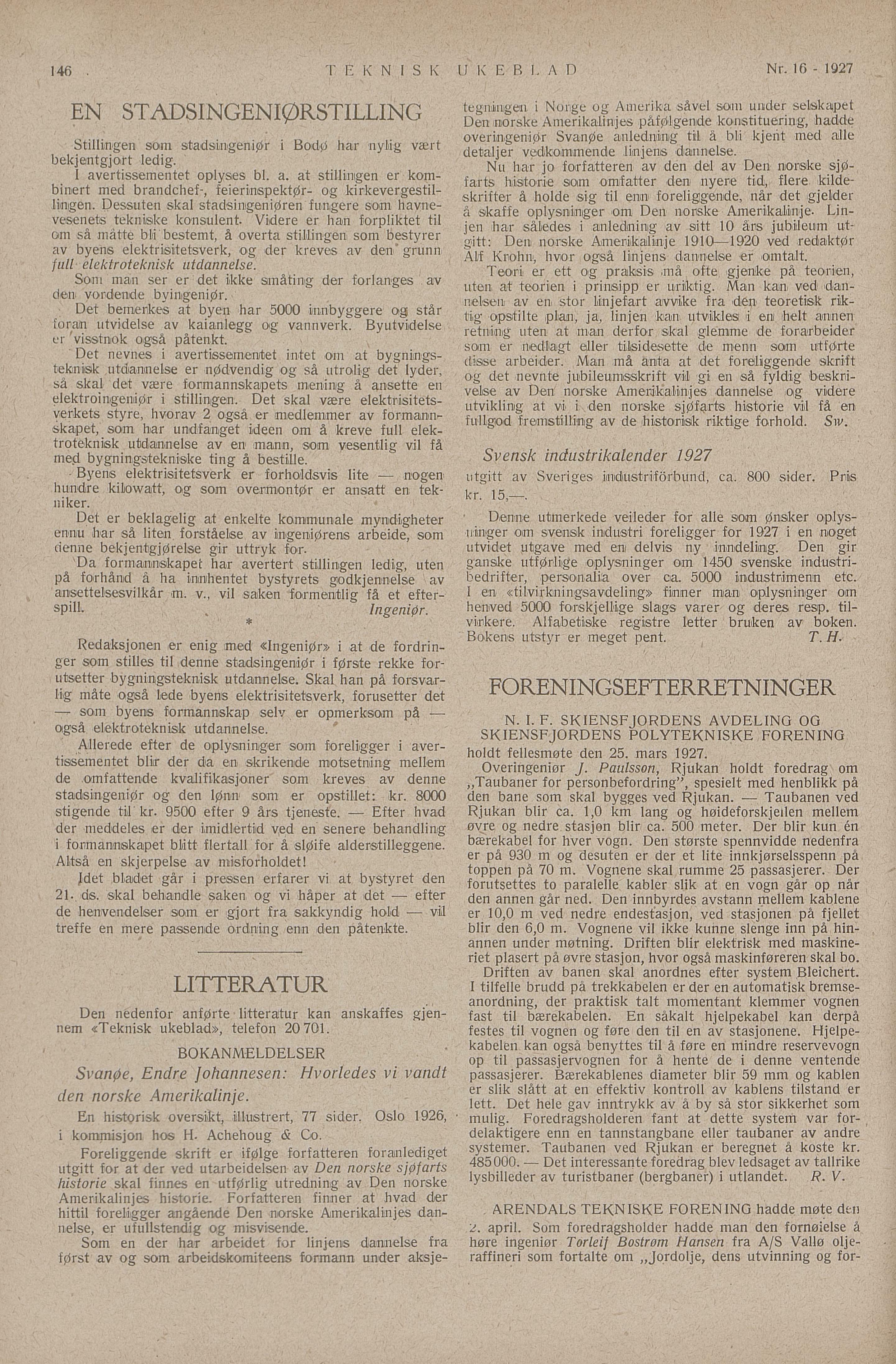 Full resolution (JPEG) - On this page / på denna sida - Nr. 16. 22. april 1927 - En stadsingeniørstilling - Litteratur - Anmeldelse: Svanøe, Endre Johannesen: Hvorledes vi vandt den norske Amerikalinje, av Sw. - Anmeldelse: Svensk industrikalender 1927, av T. H. - Foreningsefterretninger - N. I. F. Skiensfjordens avdeling og Skiensfjordens polytekniske forening, av R. V. - Arendals tekniske forening, av D. S.