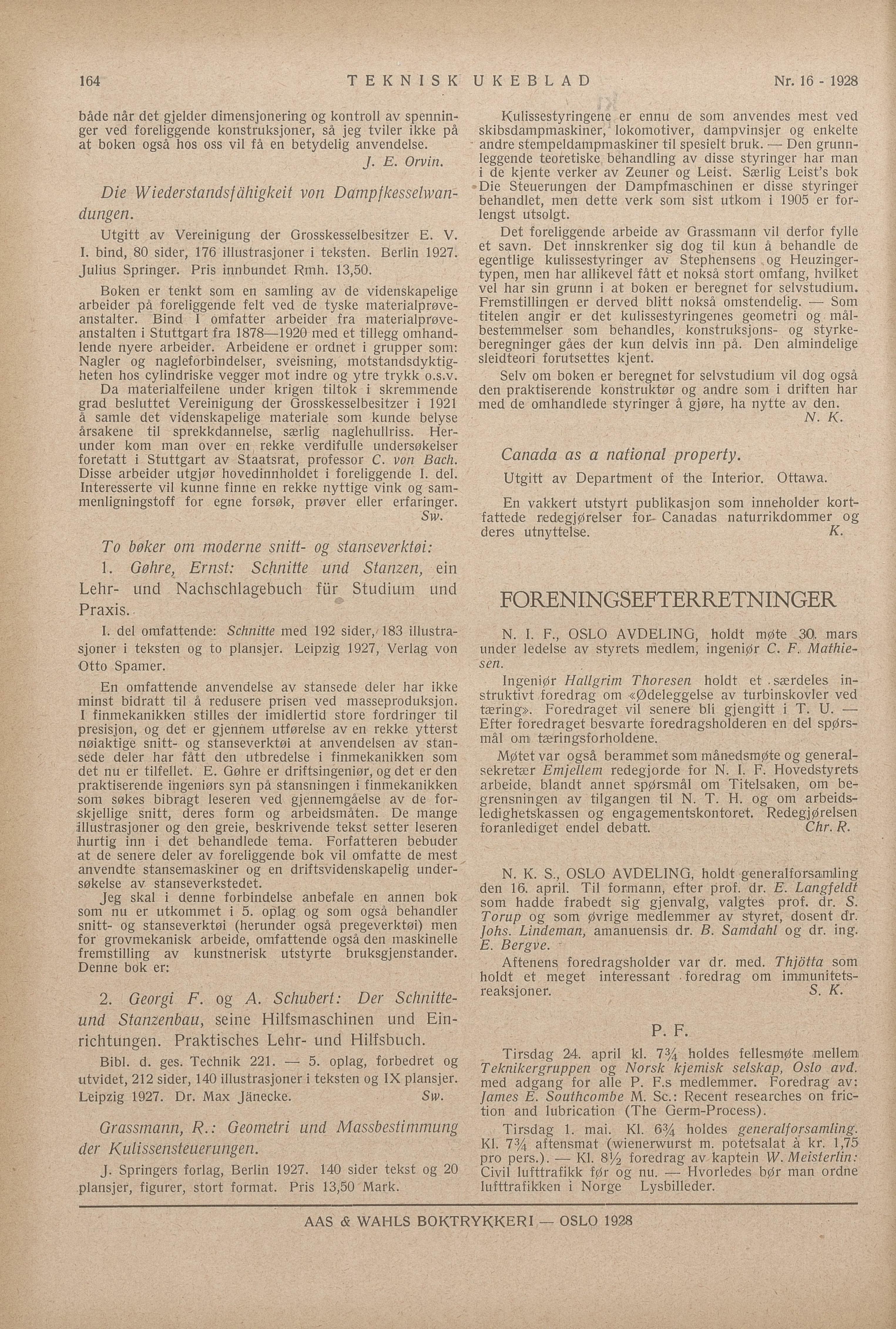 Full resolution (JPEG) - On this page / på denna sida - Nr. 16. 20. april 1928 - Litteratur - Anmeldelse: Göldel, Paul: Bemessungstafeln für Eisenbetonkonstuktionen, av J. E. Orvin - Anmeldelse: Die Wiederstandsfähigkeit von Dampfkesselwandungen, av Sw. - Anmeldelse: Gøhre, Ernst: Schnitte und Stanzen, av Sw. - Anmeldelse: Georgi F. og A. Schubert: Der Scnitte- und Stanzenbau, av Sw. - Anmeldelse: Grassmann, R.: Geometrie und Massbestimmung der Kulissensteuerungen, av N. K. - Anmeldelse: Canada as a national property, av K. - Foreningsefterretninger - N. I. F., Oslo avdeling, av Chr. R. - N. K. S., Oslo avdeling, av S. K. - P. F.