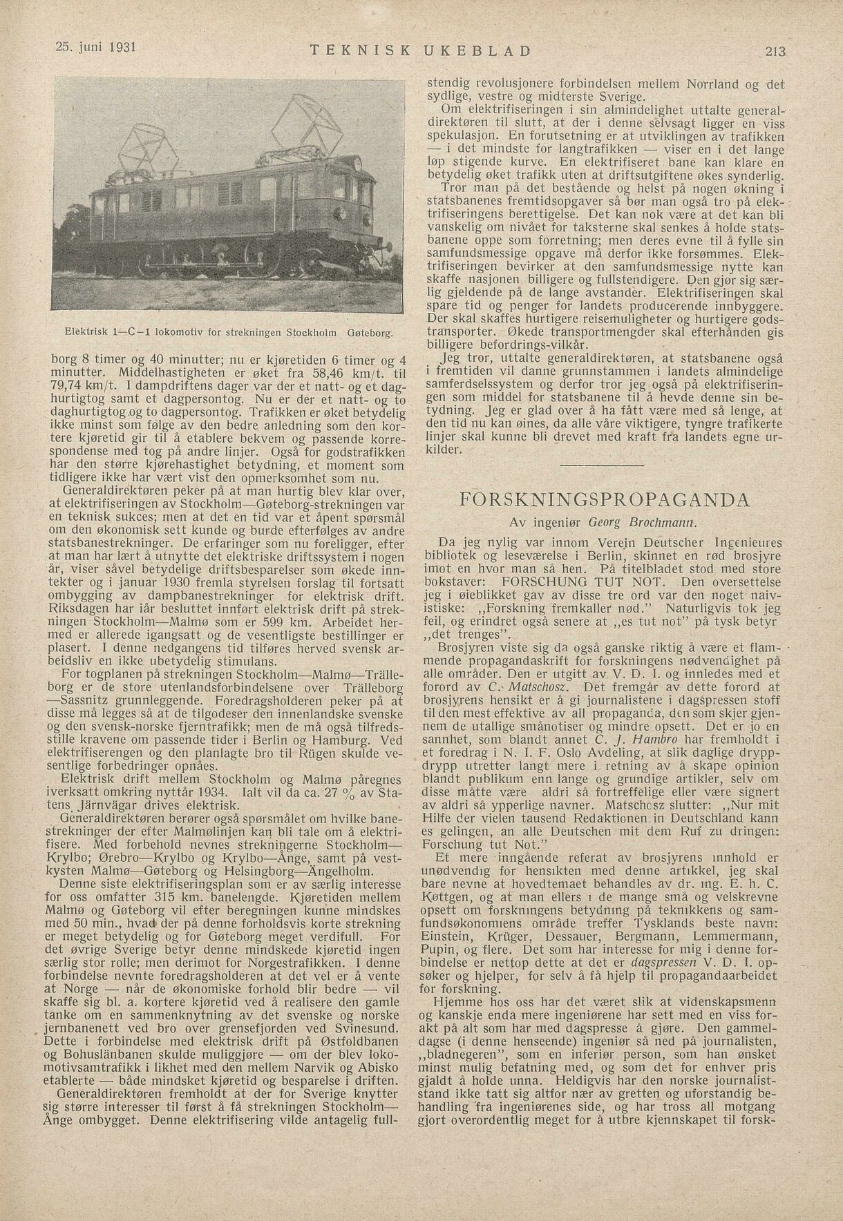 Full resolution (JPEG) - On this page / på denna sida - Nr. 19. 25. juni 1931 - De svenske statsbaners elektrisering, av Axel Granholm, bearbeidelse av Hj. Schreiner - Forskningspropaganda, av Georg Brochmann
