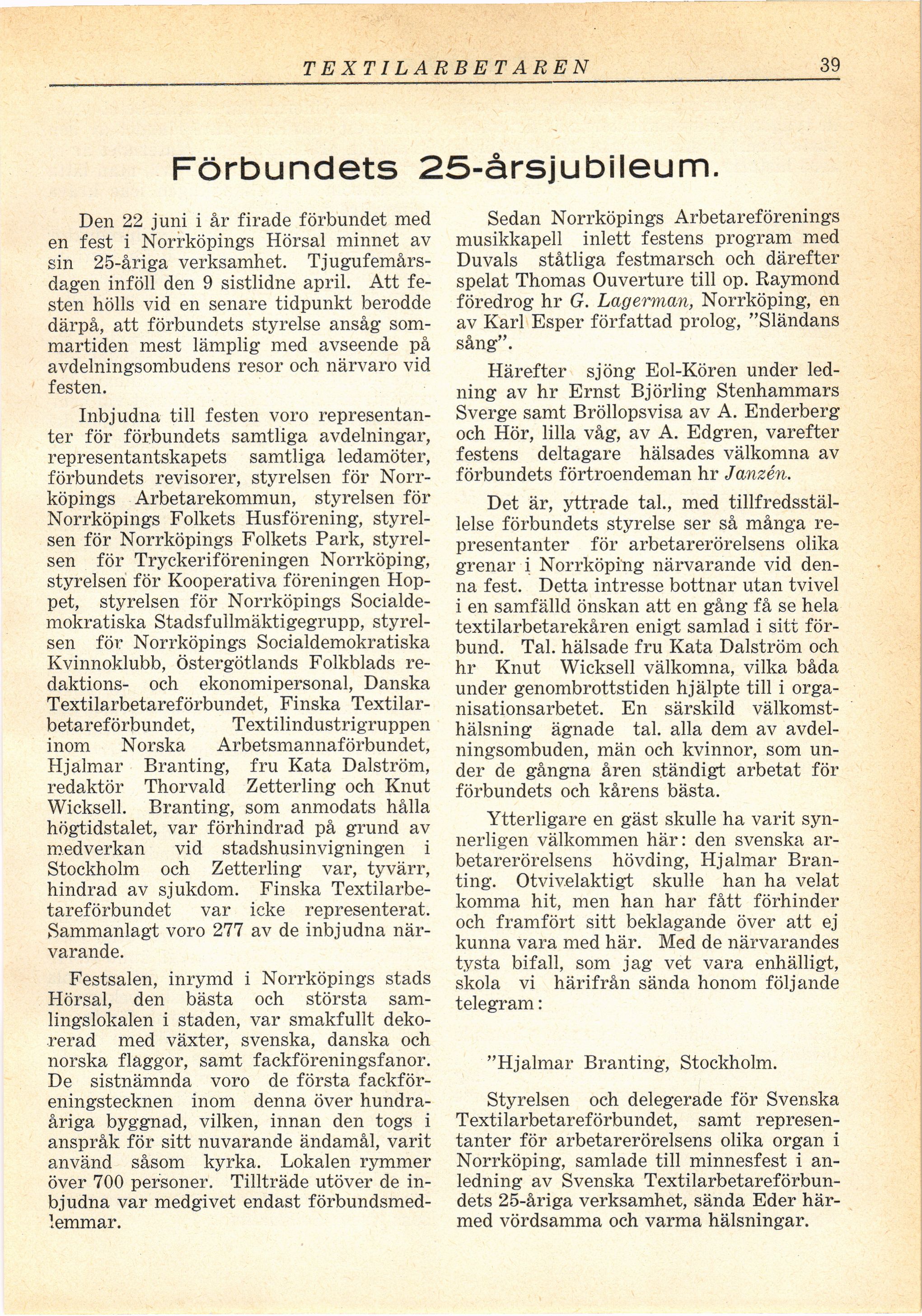 Textilarbetareförbundets 25-åriga verksamhet, sända Eder