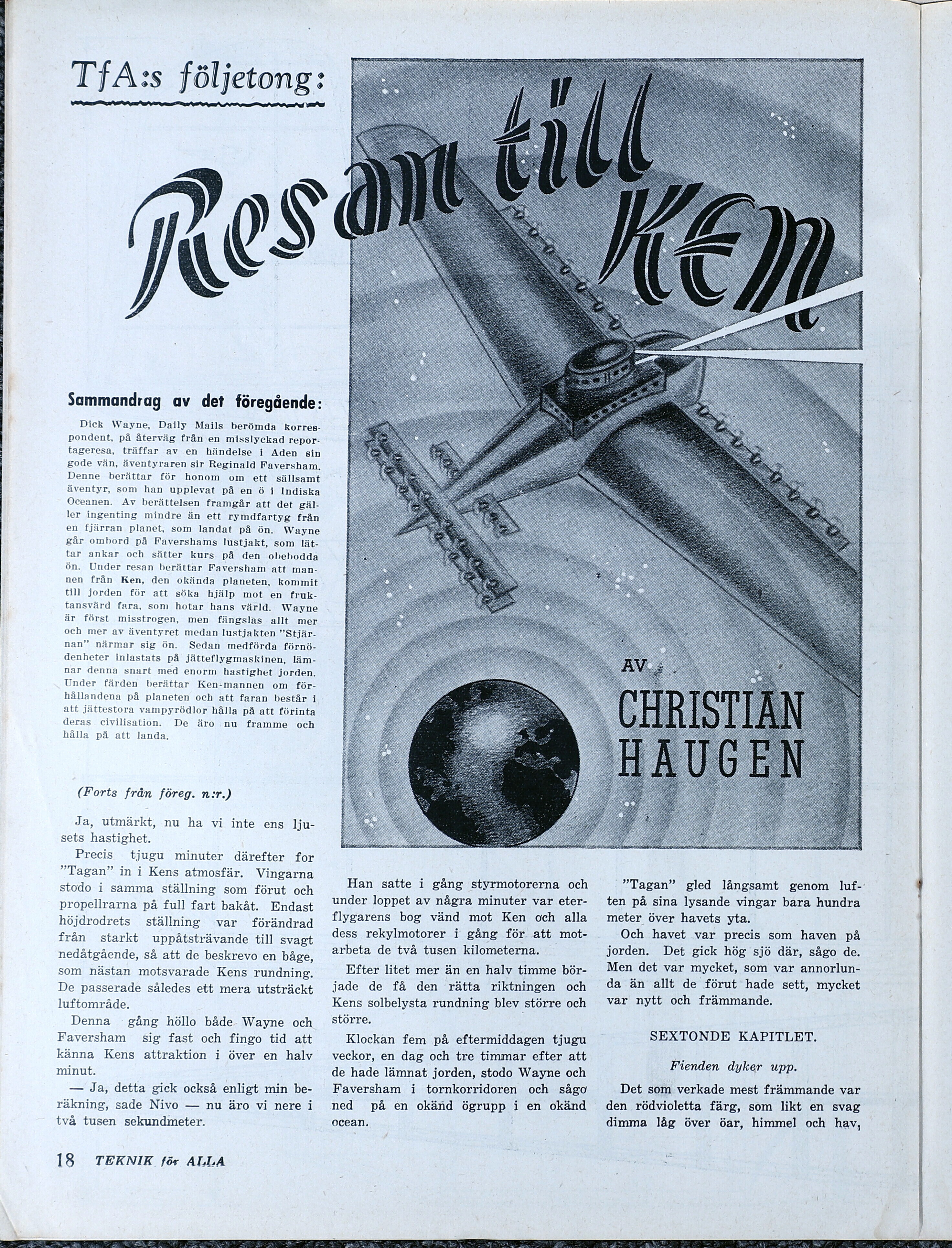 AV CHRISTIAN HAUGEN Sammandrag av det föregående: Dick Wayne, Daily Mails berömda korrespondent, på återväg från en misslyckad reportageresa, träffar av en händelse i Aden sin gode vän, äventyraren sir Reginald Faversham. Denne berättar för honom om ett sällsamt äventyr, som han upplevat på en ö i Indiska Oceanen. Av berättelsen framgår att det gäller ingenting mindre än ett rymdfartyg från en fjärran planet, som landat på ön. Wayne går ombord på Favershams lustjakt, som lättar ankar och sätter kurs på den obebodda ön. Under resan berättar Faversham att mannen från Ken, den okända planeten, kommit till jorden för att söka hjälp mot en fruktansvärd fara, som hotar hans värld. Wayne är först misstrogen, men fängslas allt mer och mer av äventyret medan lustjakten ”Stjärnan” närmar sig ön. Sedan medförda förnödenheter inlastats på jätteflygmaskinen, lämnar denna snart med enorm hastighet jorden. Under färden berättar Ken-mannen om förhållandena på planeten och att faran består i att jättestora vampyrödlor hålla på att förinta deras civilisation. De äro nu framme och hålla på att landa. (Forts från föreg. n:r.) Ja, utmärkt, nu ha vi inte ens ljusets hastighet. Precis tjugu minuter därefter for ”Tagan” in i Kens atmosfär. Vingarna stodo i samma ställning som förut och propellrarna på full fart bakåt. Endast höjdrodrets ställning var förändrad från starkt uppåtsträvande till svagt nedåtgående, så att de beskrevo en båge, som nästan motsvarade Kens rundning. De passerade således ett mera utsträckt luftområde. Denna gång höllo både Wayne och Faversham sig fast och fingo tid att känna Kens attraktion i över en halv minut. — Ja, detta gick också enligt min beräkning, sade Nivo — nu äro vi nere i två tusen sekundmeter. Han satte i gång styrmotorerna och under loppet av några minuter var eterflygarens bog vänd mot Ken och alla dess rekylmotorer i gång för att motarbeta de två tusen kilometerna. Efter litet mer än en halv timme började de få den rätta riktningen och Kens solbelysta rundning blev större och större. Klockan fem på eftermiddagen tjugu veckor, en dag och tre timmar efter att de hade lämnat jorden, stodo Wayne och Faversham i tornkorridoren och sågo ned på en okänd ögrupp i en okänd ocean. ”Tagan” gled långsamt genom luften på sina lysande vingar bara hundra meter över havets yta. Och havet var precis som haven på jorden. Det gick hög sjö där, sågo de. Men det var mycket, som var annorlunda än allt de förut hade sett, mycket var nytt och främmande.SEXTONDE KAPITLET. Fienden dyker upp.