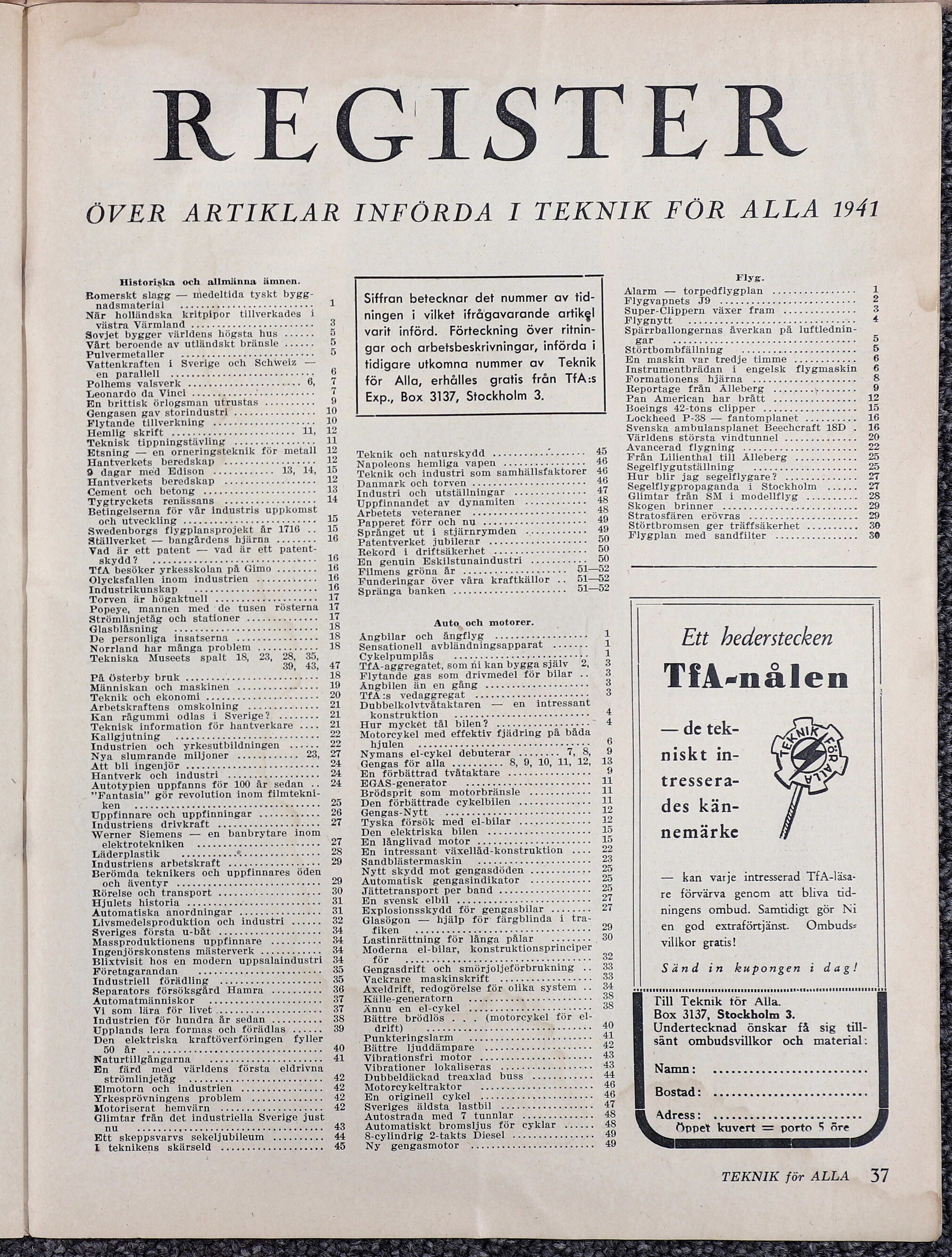 Full resolution (JPEG) - On this page / på denna sida - Register över artiklar införada i Teknik för Alla 1941