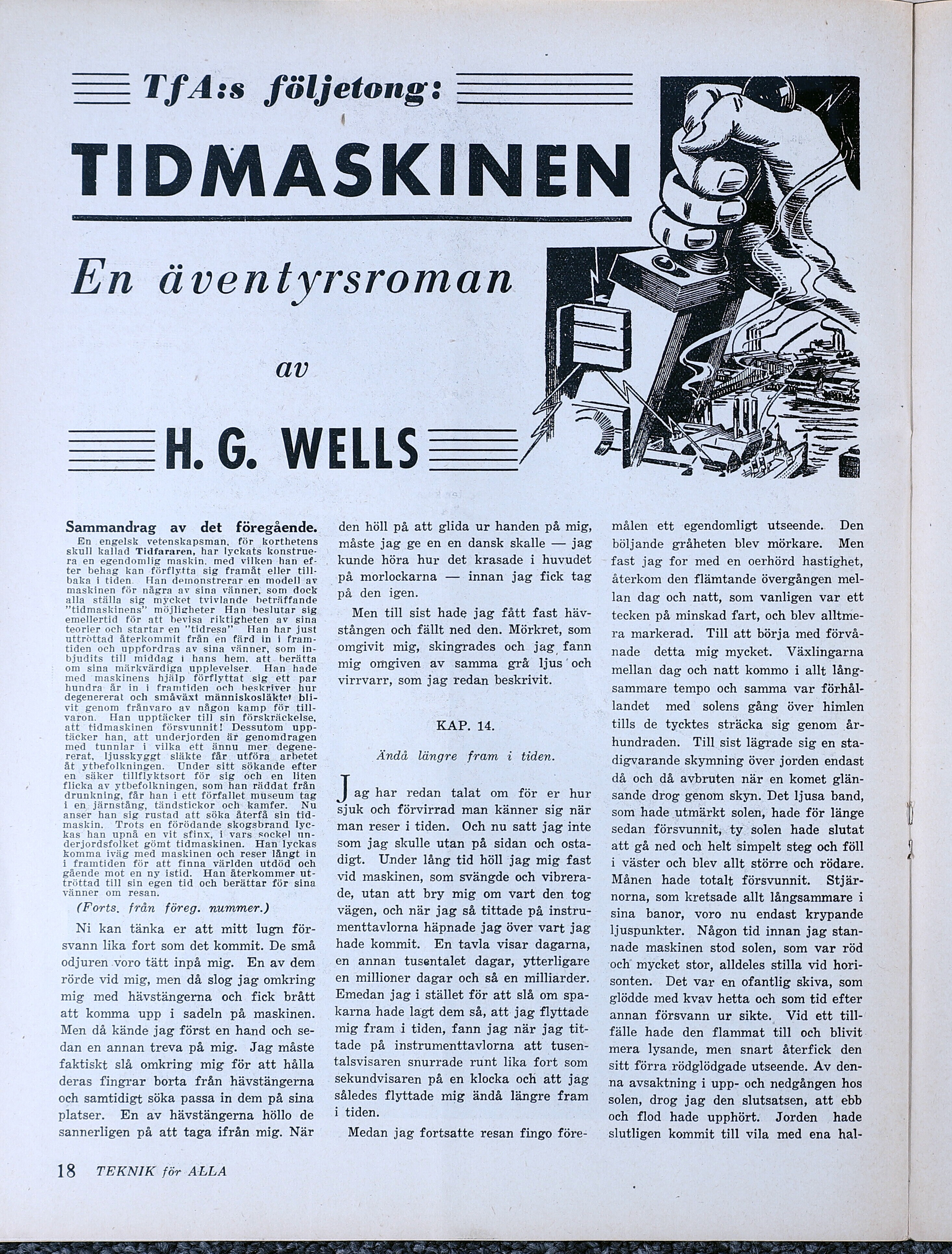 En äventyrsroman av H. G. WELLS Sammandrag av det föregående. En engelsk vetenskapsman, för korthetens skull kallad Tidfararen, har lyckats konstruera en egendomlig maskin: med vilken han efter behag kan förflytta sig framåt eller tillbaka i tiden. Han demonstrerar en modell av maskinen för några av sina vänner, som dock alla ställa sig mycket tvivlande beträffande ”tidmaskinens” möjligheter. Han beslutar sig emellertid för att bevisa riktigheten av sina teorier och startar en ”tidresa”. Han har just uttröttad återkommit från en färd in i framtiden och uppfordras av sina vänner, som inbjudits till middag i hans hem, att berätta om sina märkvärdiga upplevelser. Han hade med maskinens hjälp förflyttat sig ett par hundra år in i framtiden och beskriver hur degenererat och småväxt människosläktet blivit genom frånvaro av någon kamp för tillvaron. Han upptäcker till sin förskräckelse, att tidmaskinen försvunnit! Dessutom upptäcker han, att underjorden är genomdragen med tunnlar i vilka ett ännu mer degenererat, ljusskyggt släkte får utföra arbetet åt ytbefolkningen. Under sitt sökande efter en säker tillflyktsort för sig och en liten flicka av ytbefolkningen, som han räddat från drunkning, får han i ett förfallet museum tag i en järnstång, tändstickor och kamfer. Nu anser han sig rustad att söka återfå sin tidmaskin. Trots en förödande skogsbrand lyckas han upnå en vit sfinx, i vars sockel underjordsfolket gömt tidmaskinen. Han lyckas komma iväg med maskinen och reser långt in i framtiden för att finna världen utdöd och gående mot en ny istid. Han återkommer uttröttad till sin egen tid och berättar för sina vänner om resan. (Forts. från föreg. nummer.) Ni kan tänka er att mitt lugn försvann lika fort som det kommit. De små odjuren voro tätt inpå mig. En av dem rörde vid mig, men då slog jag omkring mig med hävstängerna och fick brått att komma upp i sadeln på maskinen. Men då kände jag först en hand och sedan en annan treva på mig. Jag måste faktiskt slå omkring mig för att hålla deras fingrar borta från hävstängerna och samtidigt söka passa in dem på sina platser. En av hävstängerna höllo de sannerligen på att taga ifrån mig. När den höll på att glida ur handen på mig, måste jag ge en en dansk skalle — jag kunde höra hur det krasade i huvudet på morlockarna — innan jag fick tag på den igen. Men till sist hade jag fått fast hävstången och fällt ned den. Mörkret, som omgivit mig, skingrades och jag fann mig omgiven av samma grå ljus och virrvarr, som jag redan beskrivit.KAP. 14. Ändå längre fram i tiden.