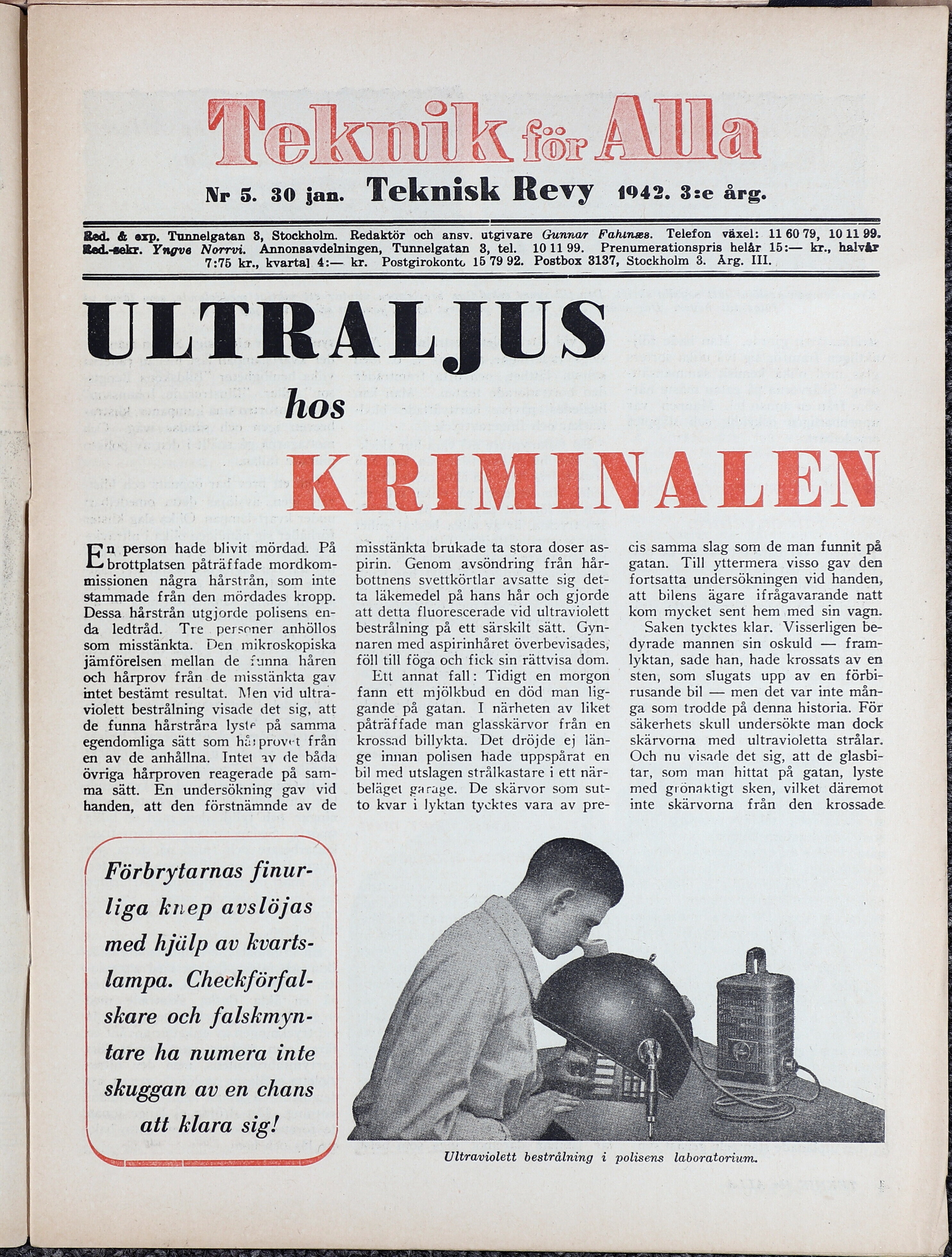 Red. & exp. Tunnelgatan 38, Stockholm. Redaktör och ansv. utgivare Gunnar Fahtnes. Telefon växel: 116079, 10 11 99.