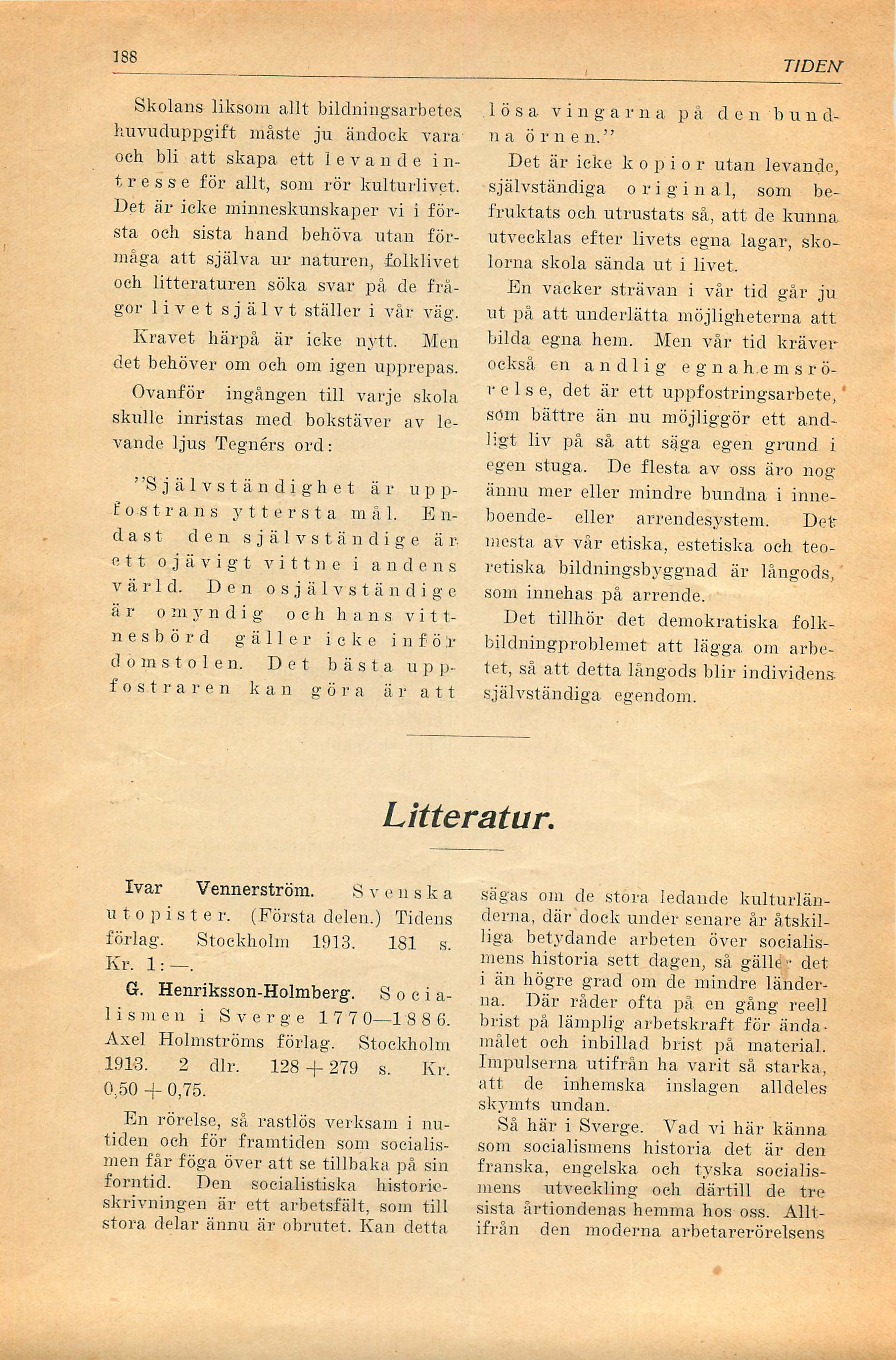 Full resolution (JPEG) - On this page / på denna sida - N:r 6, 1914 - Sandler, J.: Folkbildningens grundproblem. IV. Folkskolans undervisande och fostrande gärning - Litteratur - Ivar Wennerström. Svenska utopister; G. Henriksson-Holmberg. Socialismen i Sverge 1770—1856 (R. S.)