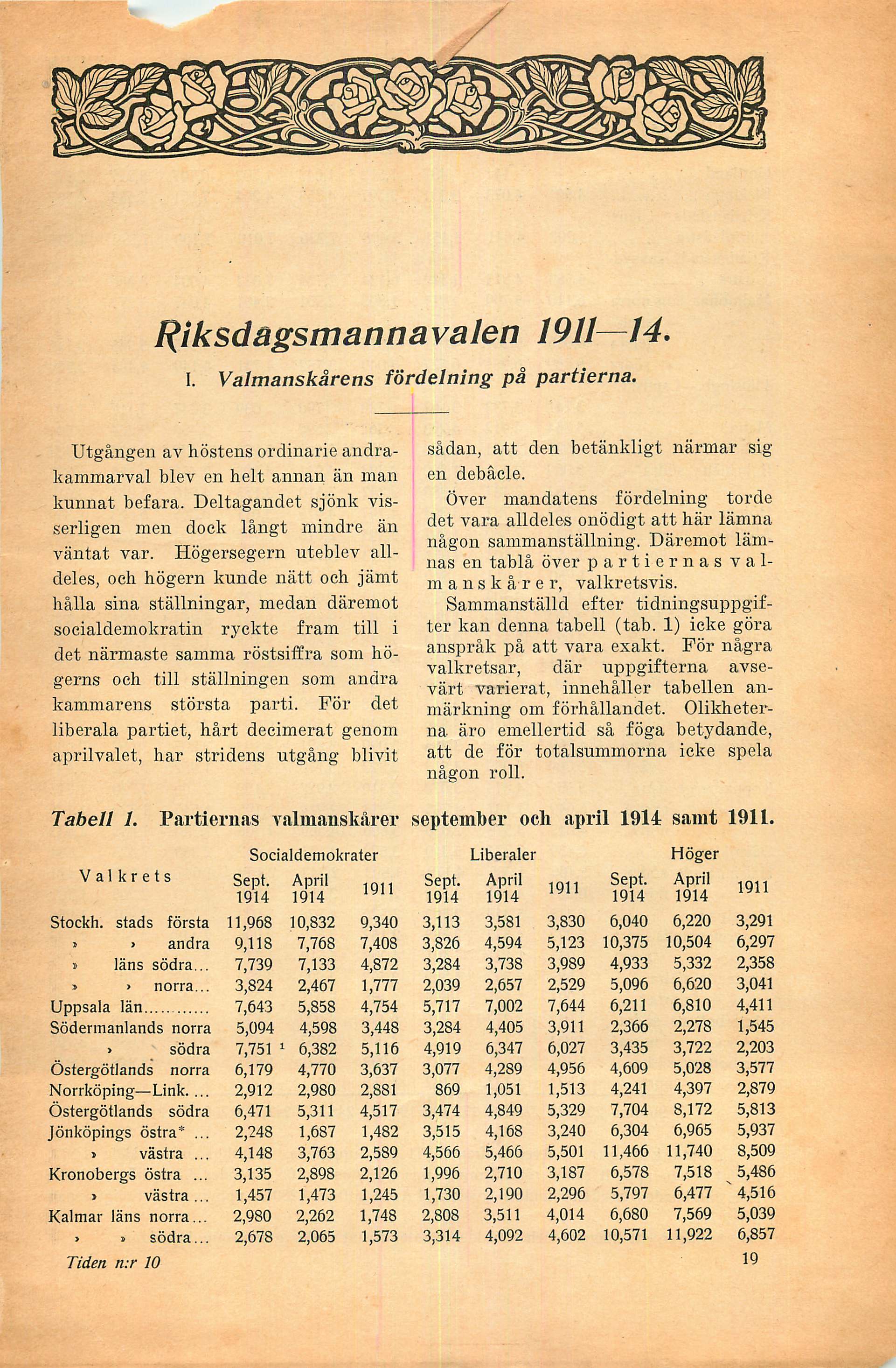Full resolution (JPEG) - On this page / på denna sida - N:r 10, 1914 - Sandler, R.: Riksdagsmannavalen 1911—14. I. Valmanskårens fördelning