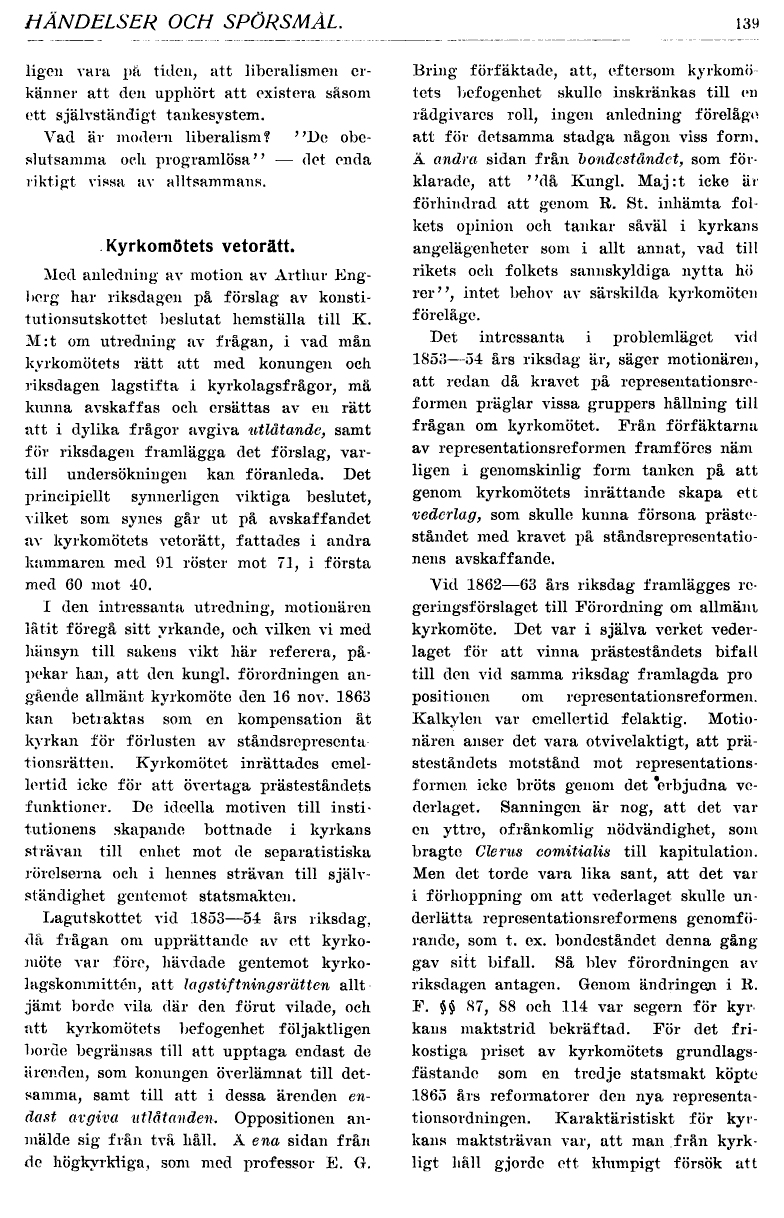 Full resolution (TIFF) - On this page / på denna sida - N:r 3, juni 1920 - Händelser och spörsmål - Vad är modern liberalism - Kyrkomötets vetorätt