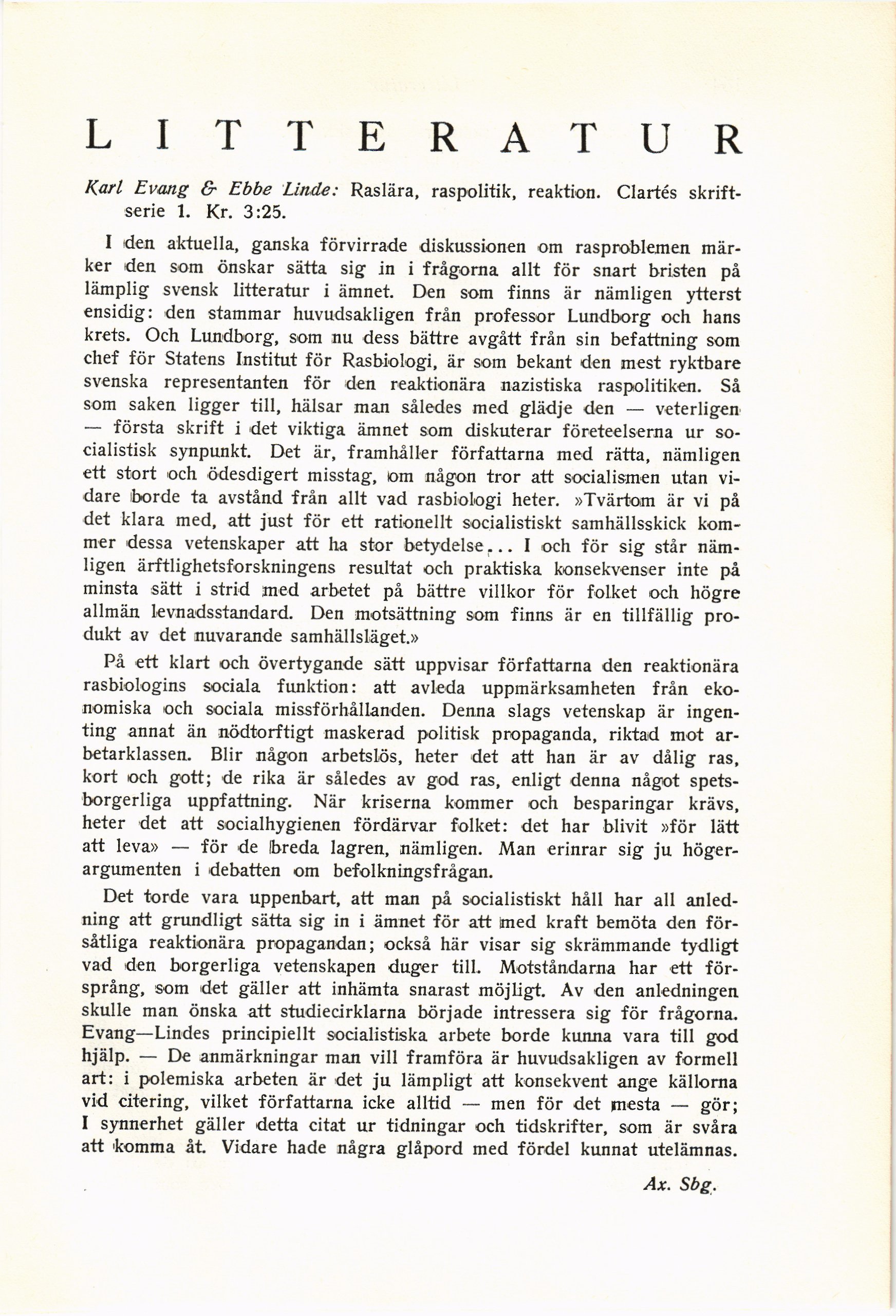 Karl Evang & Ebbe Lindé: Raslära, raspolitik, reaktion. Clartés