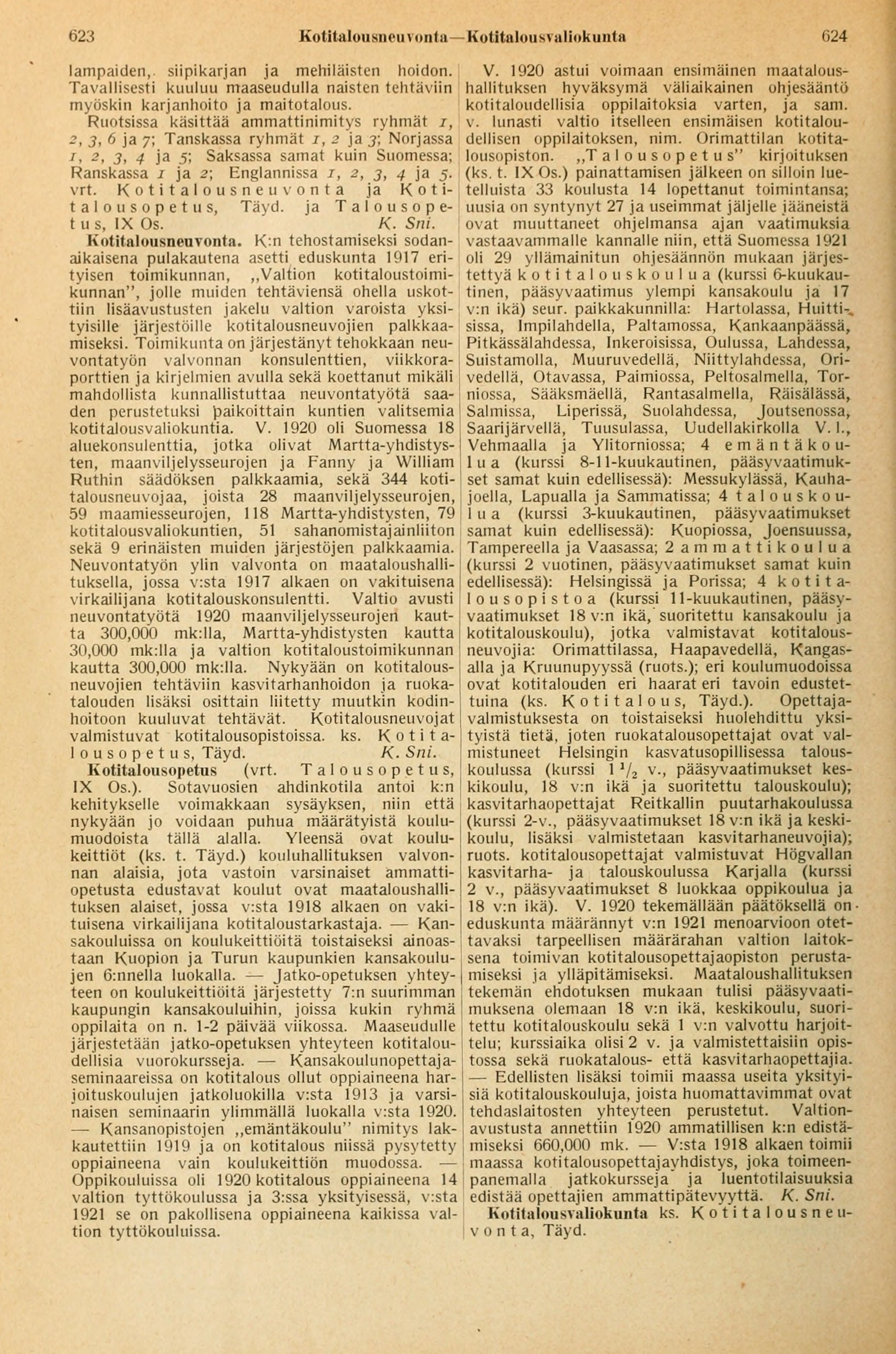 Kotitalousopetus, Täyd. K. Sni.