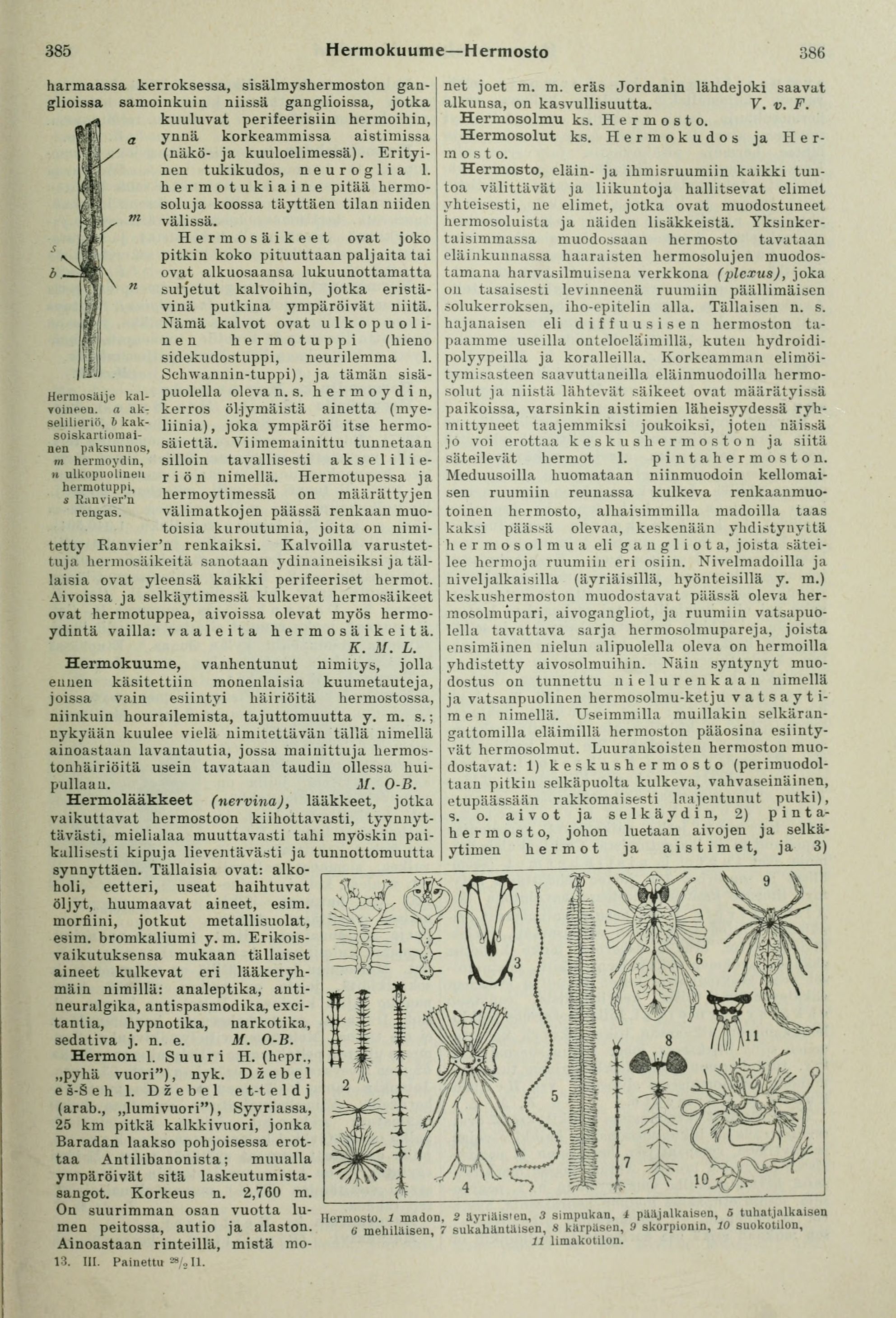 Hermosto. 1 madon. 2 äyriäisten, 3 simpukan, l pääjalkaisen, S tuhatjalkaisen