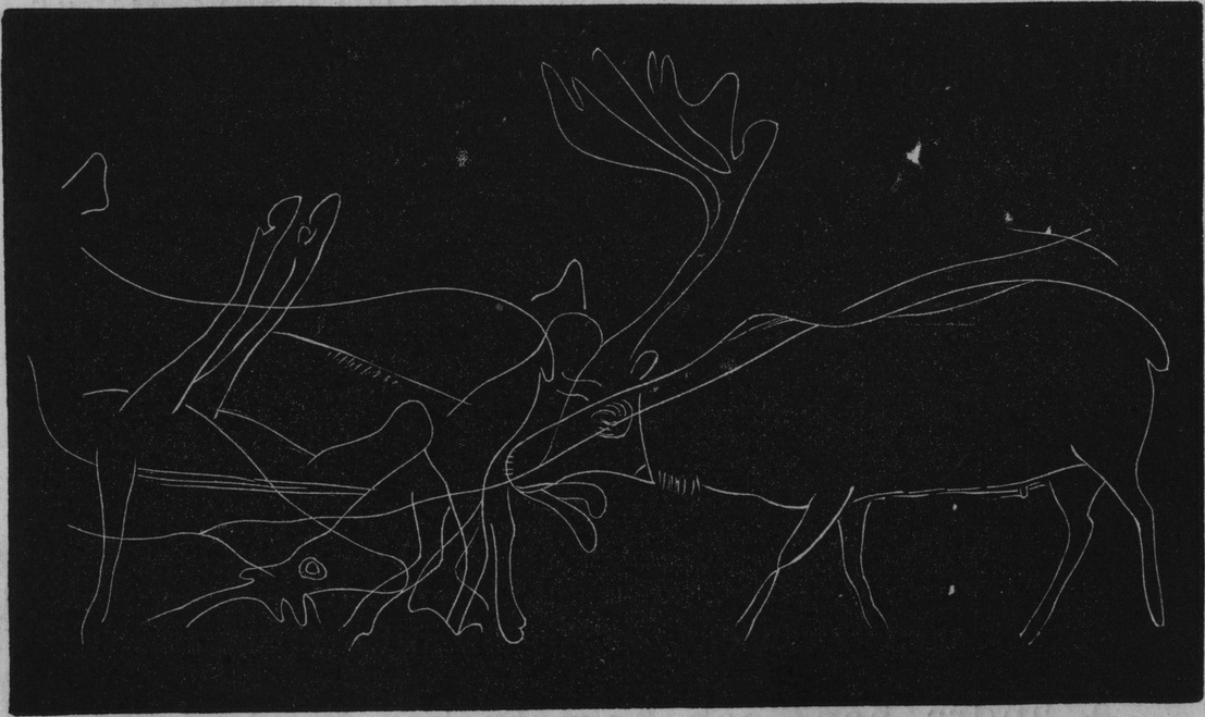 Bild 27. Afbildning af en strid mellan renar, inristad å en skifferbit. Från en grotta i södra Frankrike. |