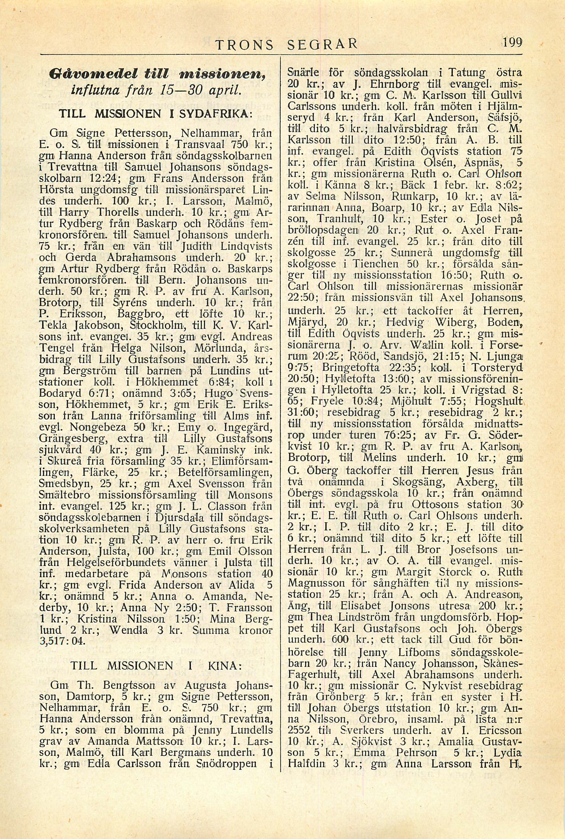 son 5 kr.; Emma Pehrson 5 kr.; Lydia