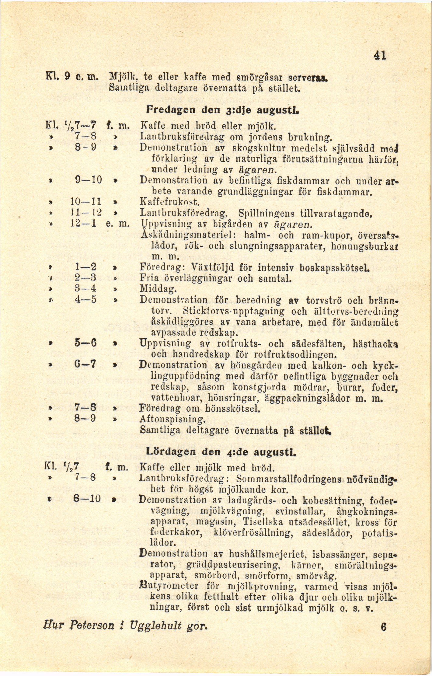 “ | 8—10 | “ | Demonstration av ladugårds- och kobesättning, fodervägning, mjölkvägning, svinstallar, ångkokningsapparat, magasin, Tisellska utsädessållet, kross för foderkakor, klöverfrösållning, sädeslådor, potatislådor.