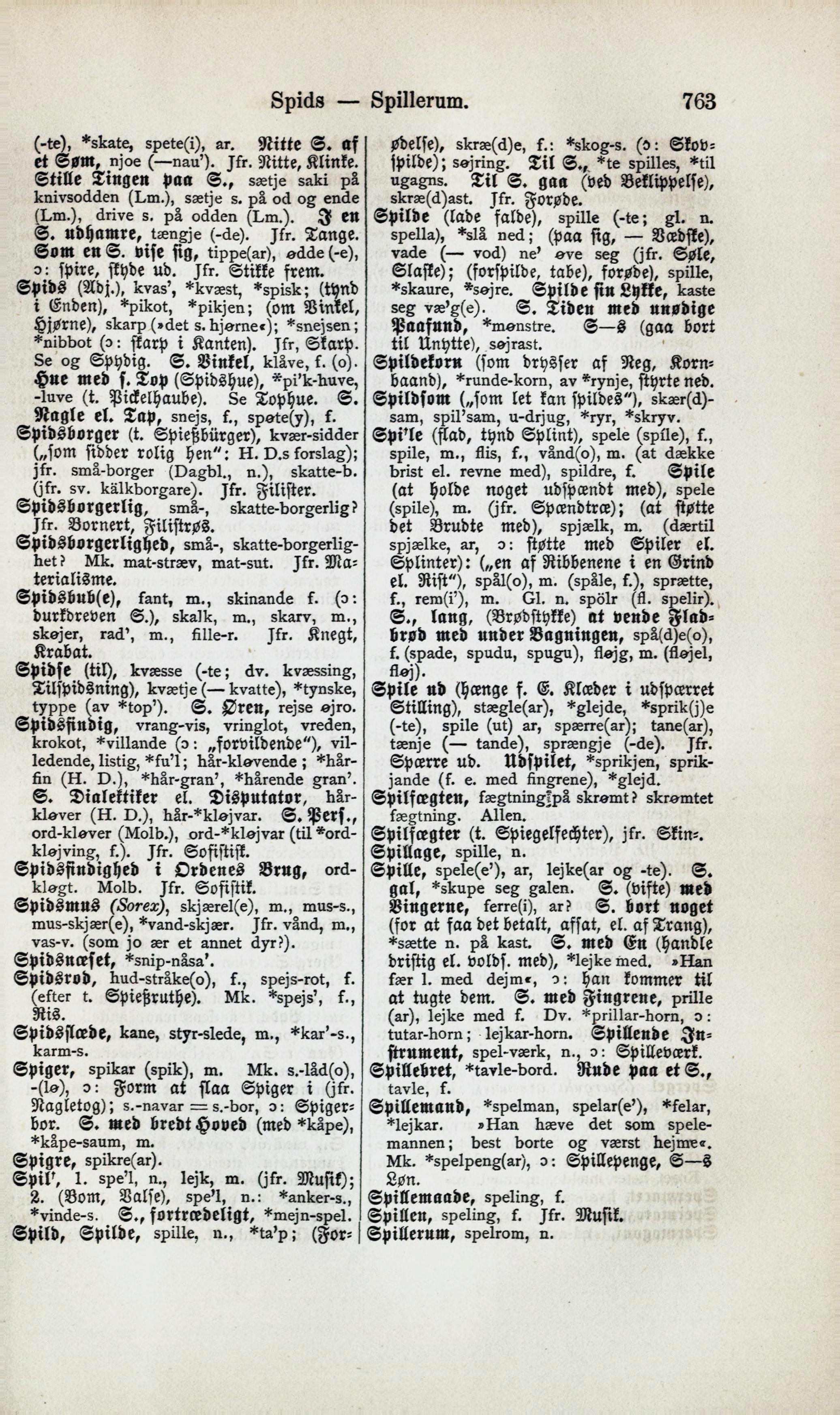 Spil’, 1. spe’l, n., lejk, m. (jfr. Musit);