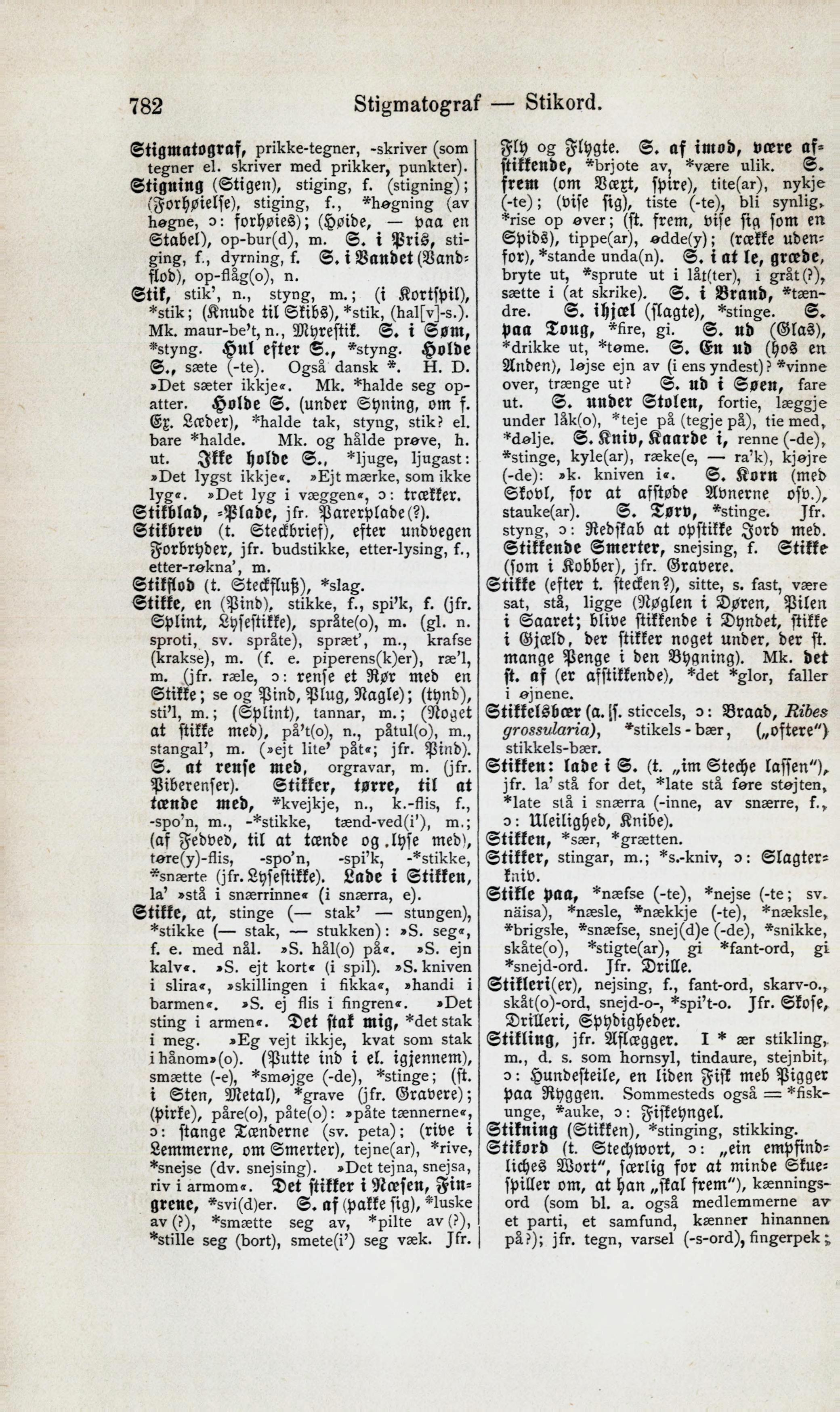 Stikle, en (Pind). stikke, f., spik, f. (jfr.