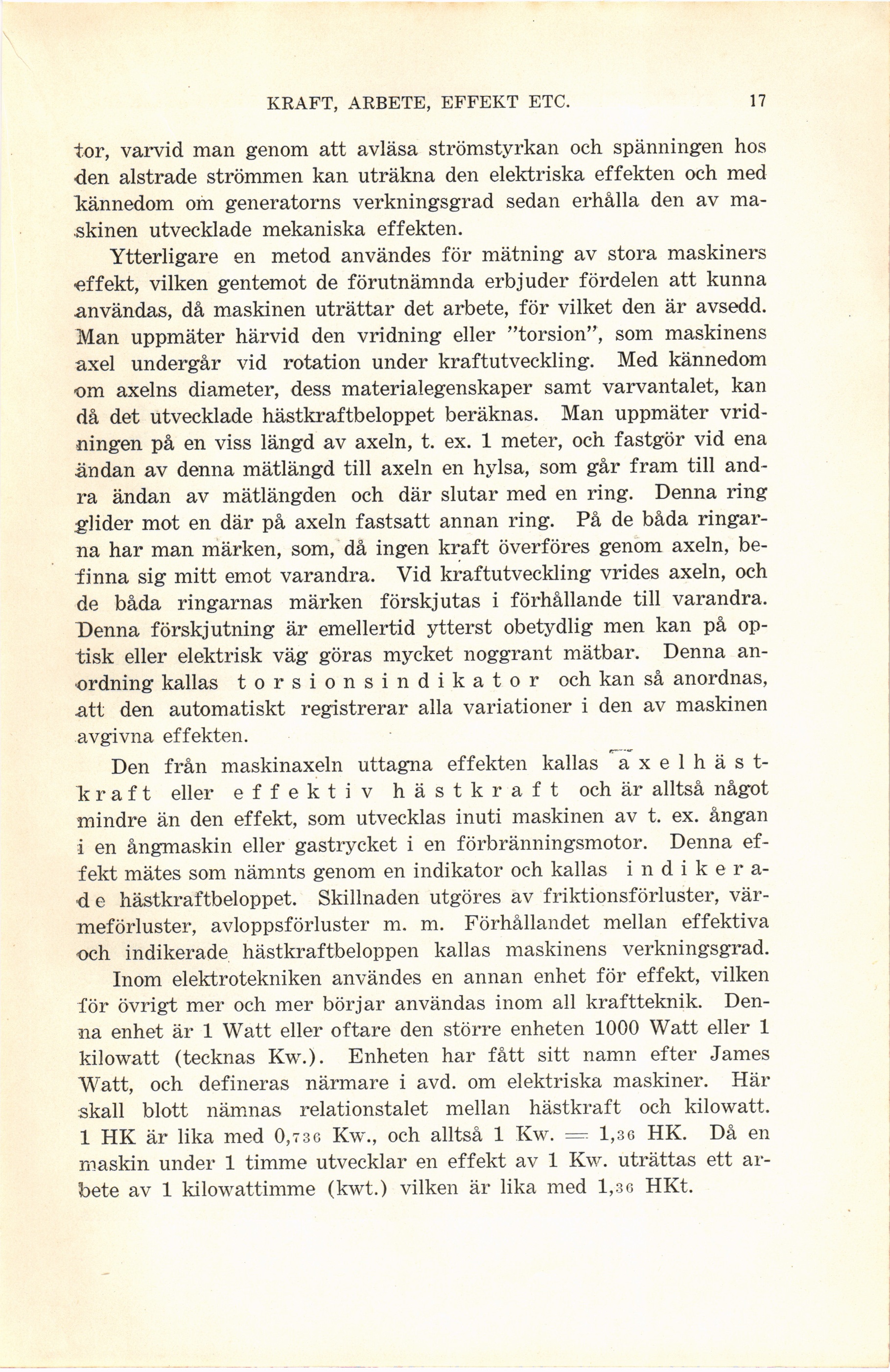 arbete av 1 kilowattimme (kwt.) vilken är lika med 1,36 HKt.