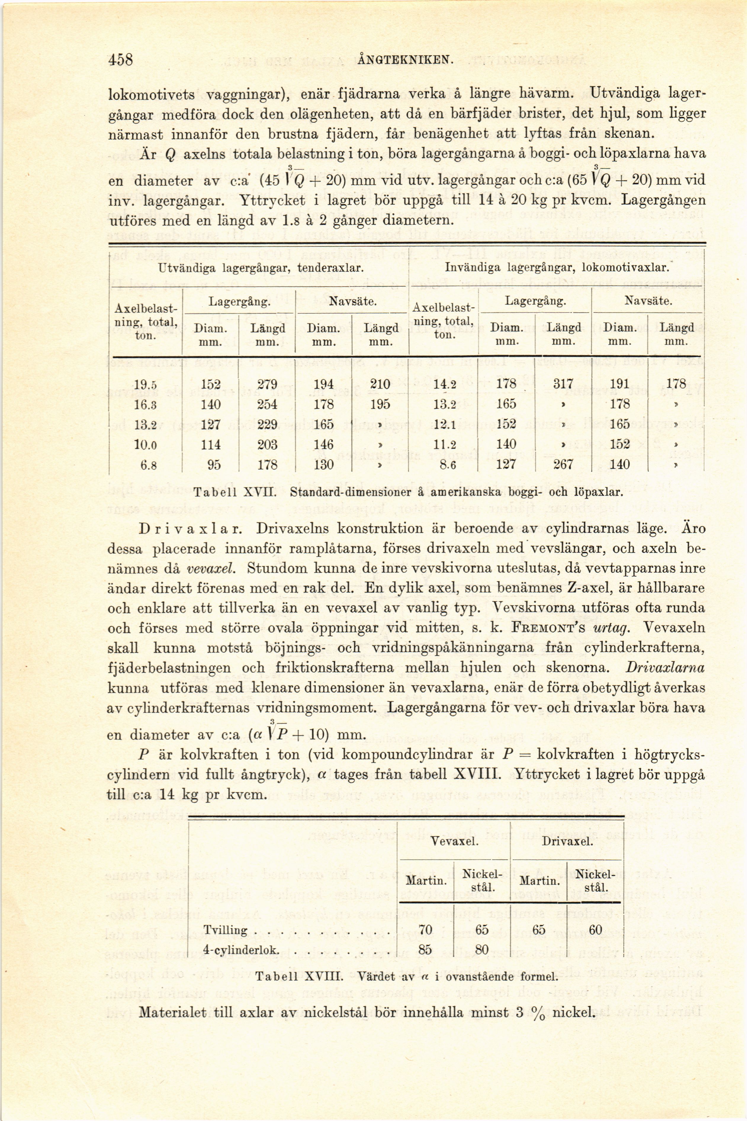 Tabell XVII. Standard-dimensioner å amerikanska boggi- och löpaxlar.