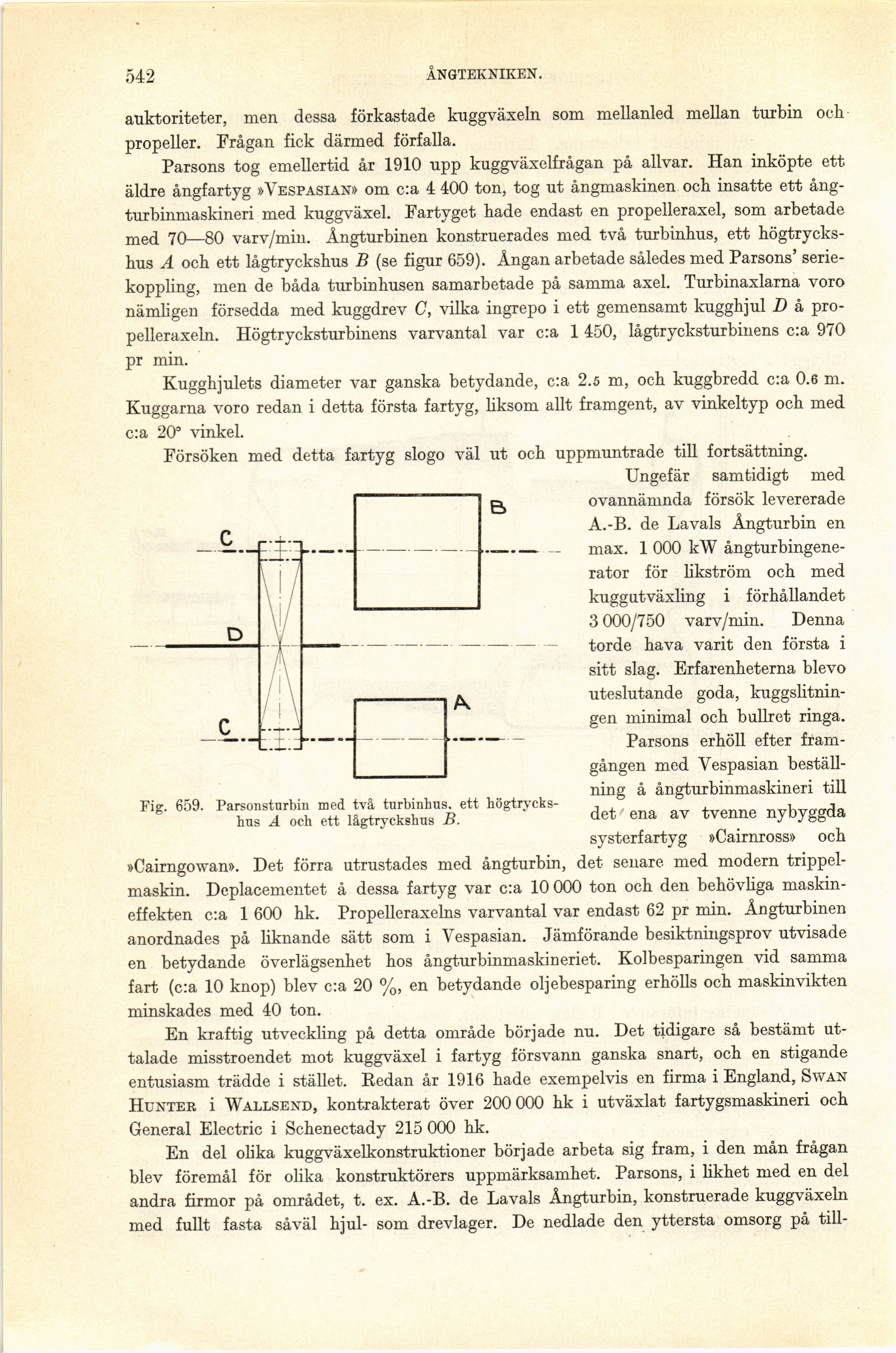 högtrycks-hus A och ett lågtryckshus B (se figur 659). Ångan arbetade således med Parsons’