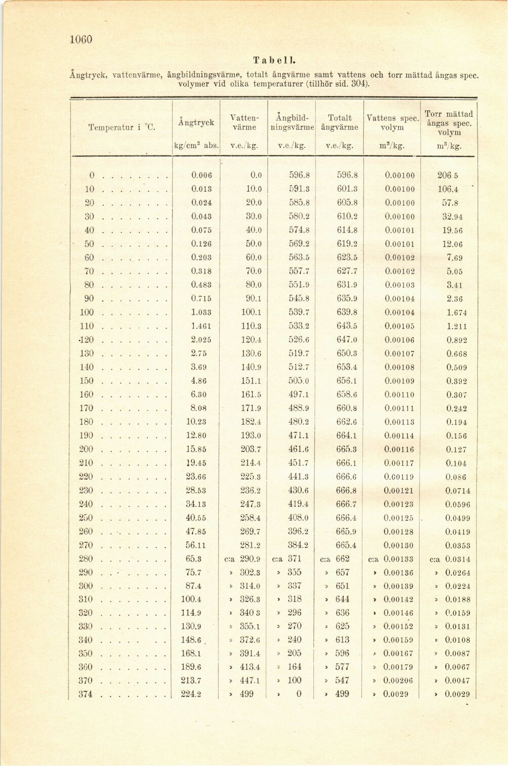 Temperatur i °C. Å ngtryck kg/cm2 abs. [-Vattenvärme-] {+Vatten- värme+} v.e./kg. [-Ångbildningsvärme-] {+Ångbild- ningsvärme+} v.e./kg. Totalt ångvärme v.e./kg. Vattens spec. volym m3/kg. Torr mättad ångas spec. volym ms/kg.