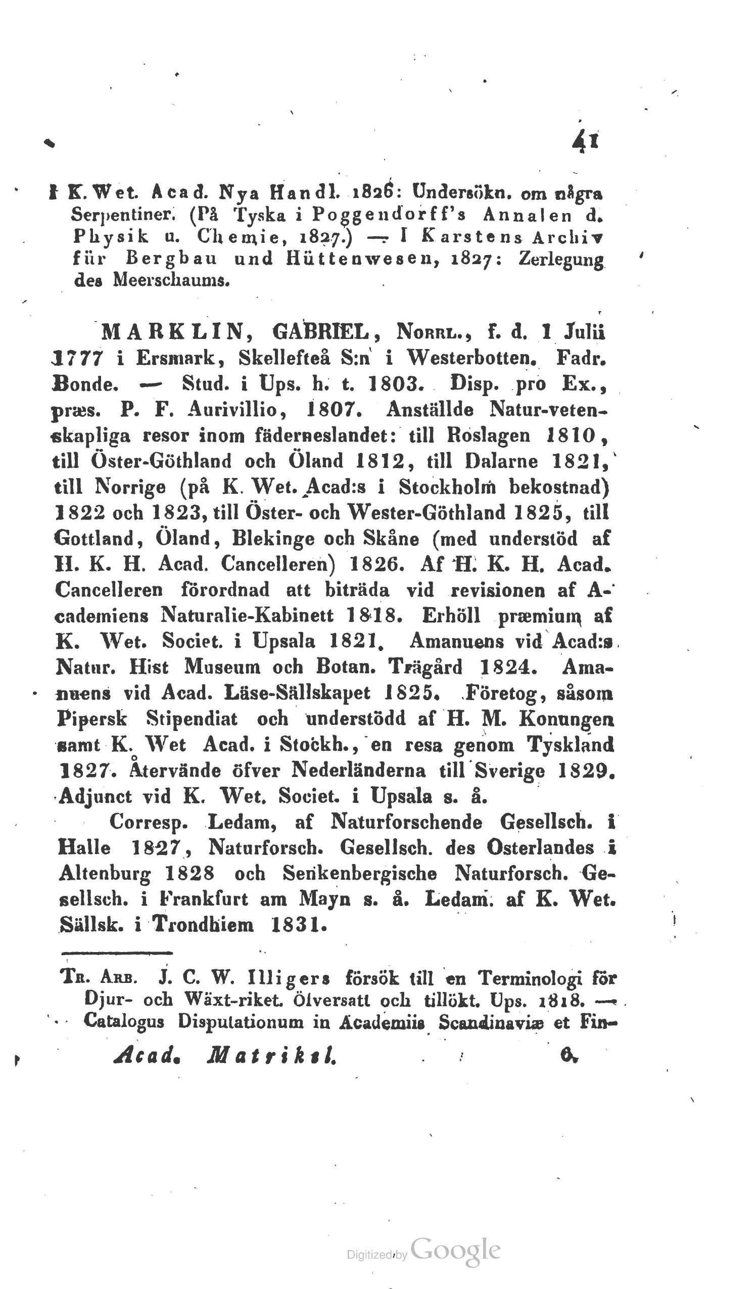 pres. P. F. Aurivillio, 1807. Anställde Natur-veten-