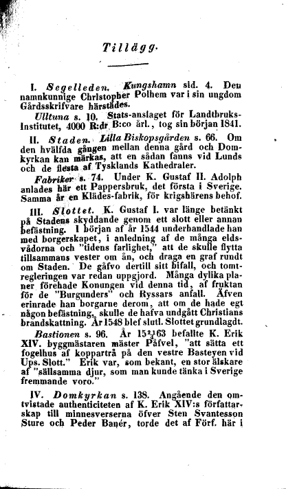 I. Segelleden. Kungshamn sid. 4. Den namnkunnige Christopher Polhem var i sin ungdom Gårdsskrifvare härstädes. Ulltuna s. 10, Stats-anslaget för Landtbruks-Institutet, 4000 R:dr B:co årl., tog sin början 1841. II. Staden. Lilla Biskopsgården s. 66. Om den hvälfda gången mellan denna gård och Domkyrkan kan märkas, att en sådan fanns vid Lunds och de flesta af Tysklands Kathedraler. Fabriker s. 74. Under K. Gustaf II. Adolph anlades här ett Pappersbruk, det första i Sverige. Samma år en Klädes-fabrik, för krigshärens behof. III. Slottet K. Gustaf I. var länge betänkt på Stadens skyddande genom ett slott eller annan befästning. I början af år 1544 underhandlade han med borgerskapet, i anledning af de många eldsvådorna och "tidens farlighet," att de skulle flytta tillsammans vester om ån, och draga en graf rundt om Staden. De gåfvo dertill sitt bifall, och tomtregleringen var redan uppgjord. Många dylika planer förehade Konungen vid denna tid, af fruktan för de "Burgunders" och Ryssars anfall. Äfven erinrade han borgarne derom, att om de hade egt någon befästning, skulle de hafva undgått Christians brandskattning. År 1548 blef slutl. Slottet grundlagdt. Bastionen s. 96. År 1521/463 befallte K. Erik XIV. byggmästaren mäster Påfvel, "att sätta ett fogelhus af koppartrå på den vestre Basteyen vid Ups. Slott." Erik var, som bekant, en stor älskare af "sällsamma djur, som man kunde tänka i Sverige fremmande voro." IV. Domkyrkan s. 138. Angående den omtvistade authenticiteten af K. Erik XIV:s författarskap till minnesverserna öfver Sten Svantesspn Sture och Peder Banér, torde det af Förf. här i << prev. page << föreg. sida << >> nästa sida >> next page >> Project Runeberg, Fri Oct 18 18:27:26 2024 (aronsson) (diff) (history) (download) << Previous Next >> https://runeberg.org/upsalamin/0013.html |