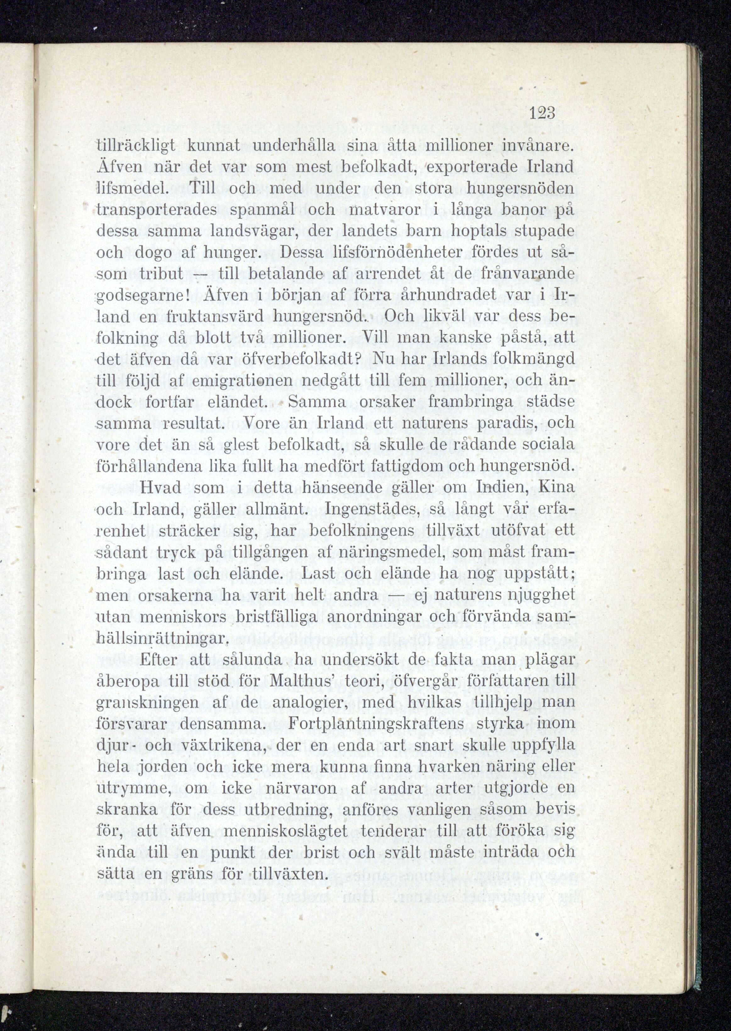 åberopa till stöd för Malthus’ teori, öfvergår författaren till •