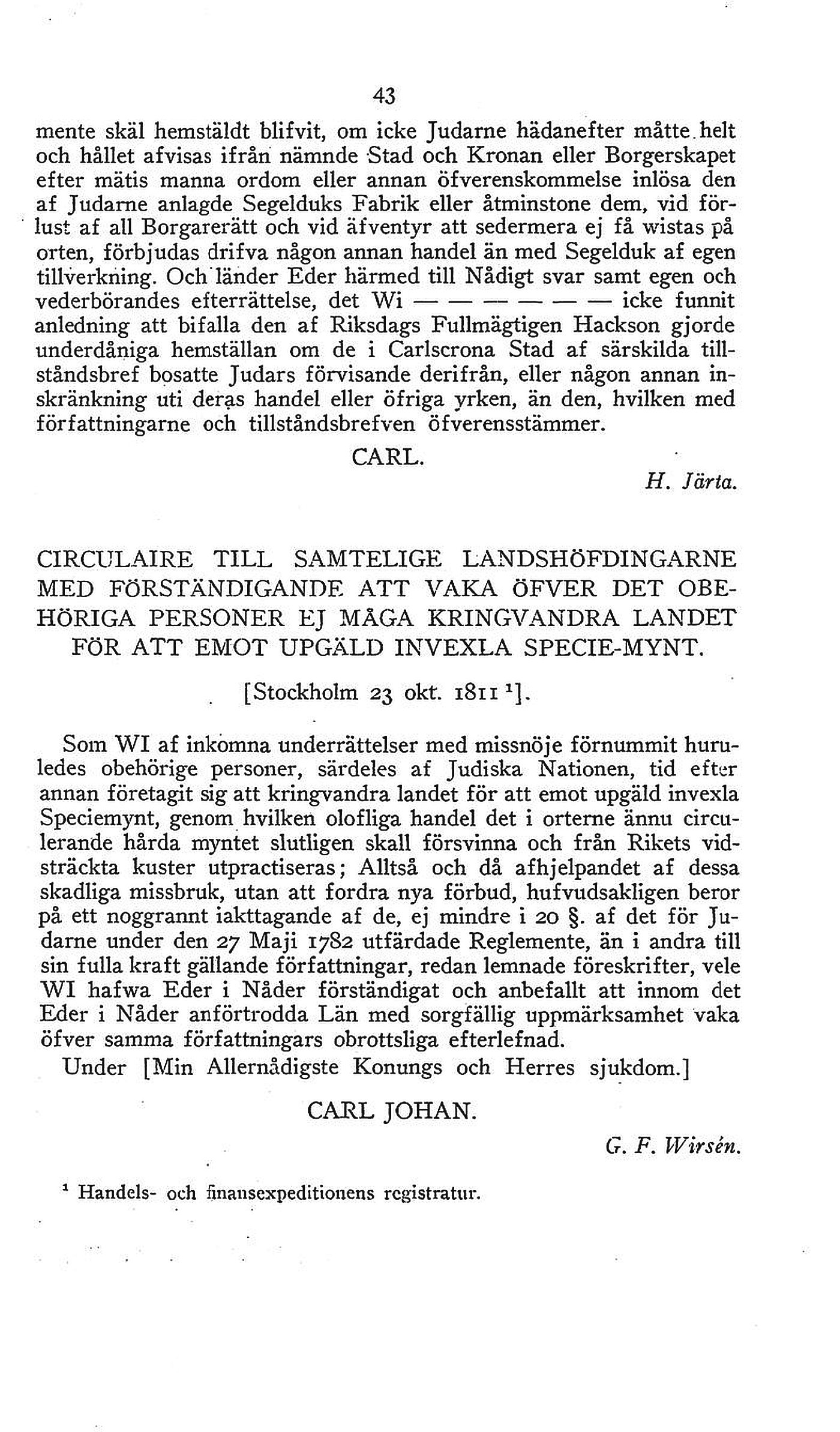 Full resolution (JPEG) - On this page / på denna sida - Akter rörande judarnas rättsliga ställning i Sverige - 1811 febr. 6. [Kungl. brev till landshövdingen i Blekinge län ang. riksdagsman Hacksons begäran, att alla judar måtte förvisas från Karlskrona] - 1811 okt. 23. Circulaire till samtelige landshöfdingarne med förständigande att vaka öfver det obehöriga personer ej måga kringvandra landet för at emot upgäld invexla Specie-mynt