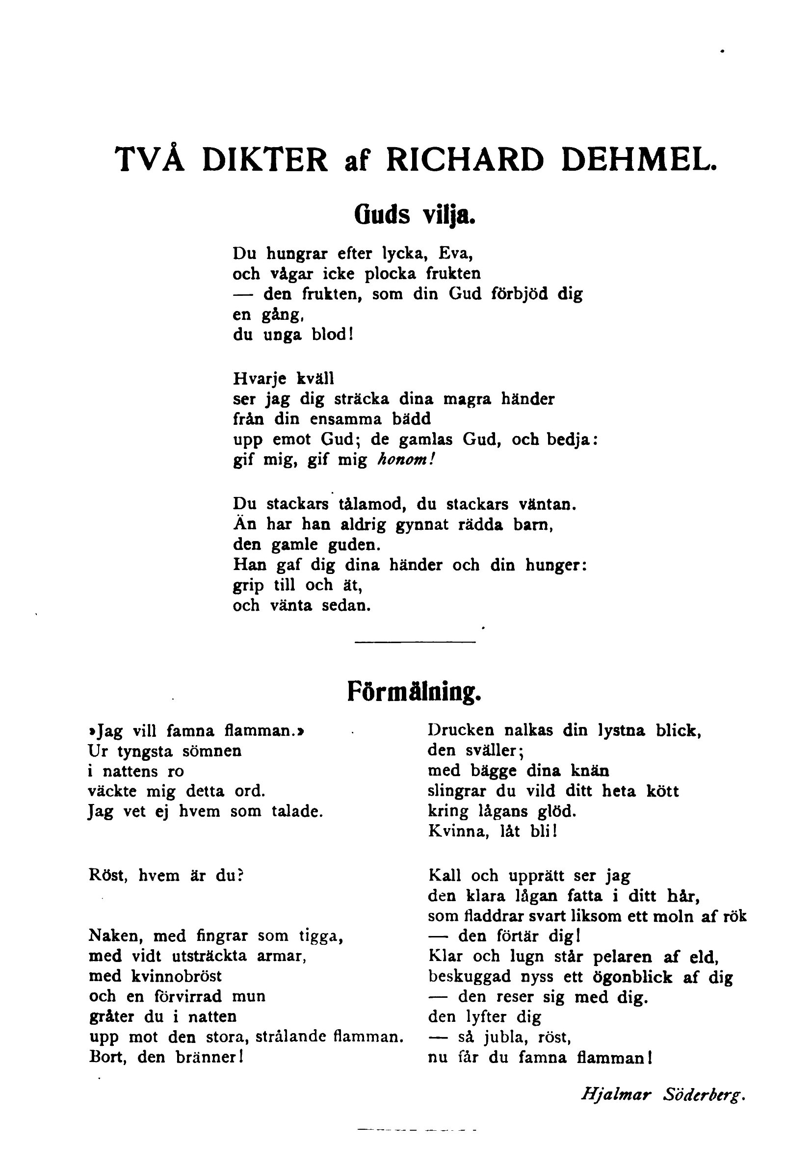 Full resolution (JPEG) - On this page / på denna sida - N:o 4, april 1903 - Två dikter af Richard Dehmel. Öfversättning af Hjalmar Söderberg - Guds vilja - Förmälning