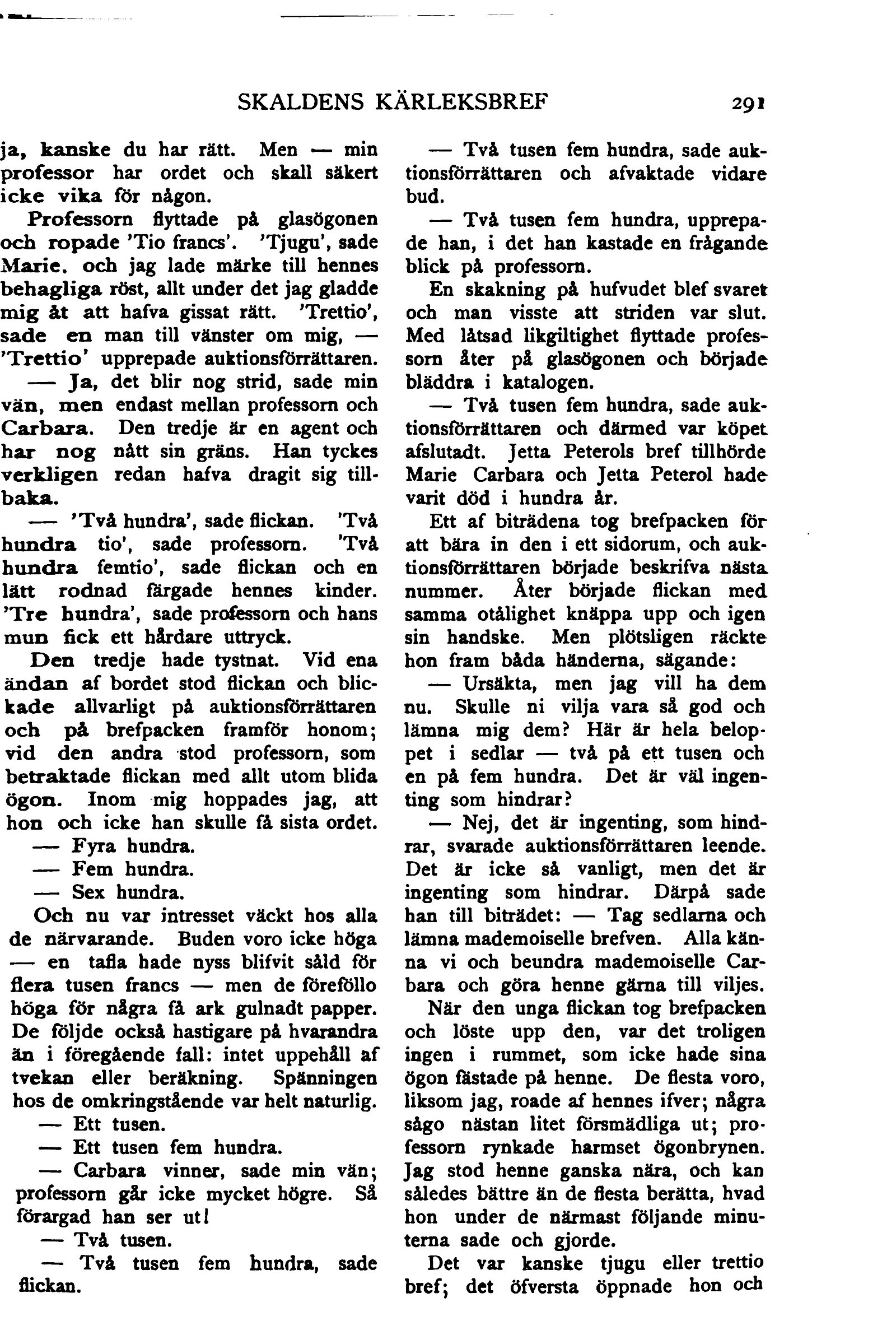 och ropade ’Tio francs’. ’Tjugu’, sade