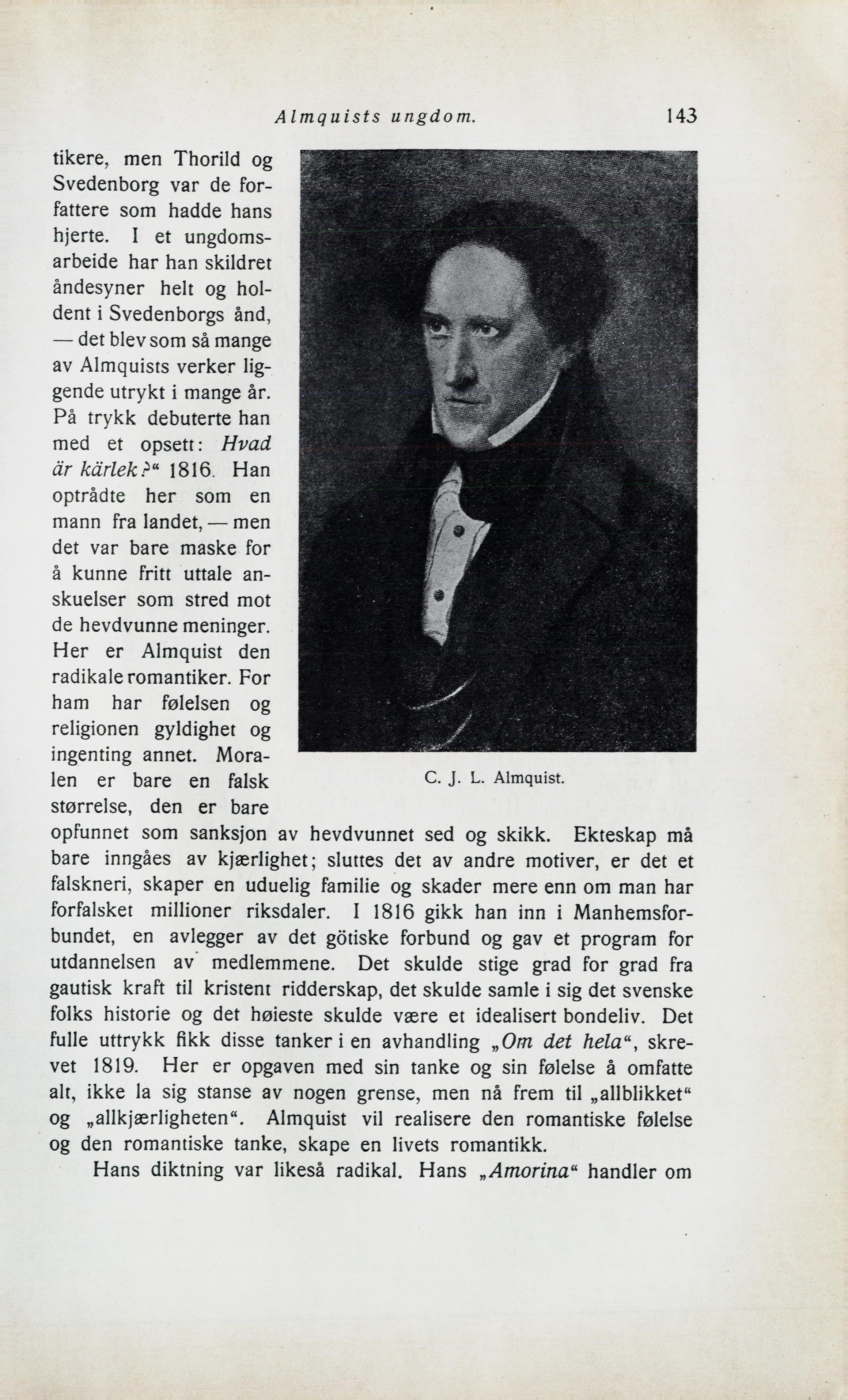 og „allkjærligheten". Almquist vil realisere den romantiske følelse